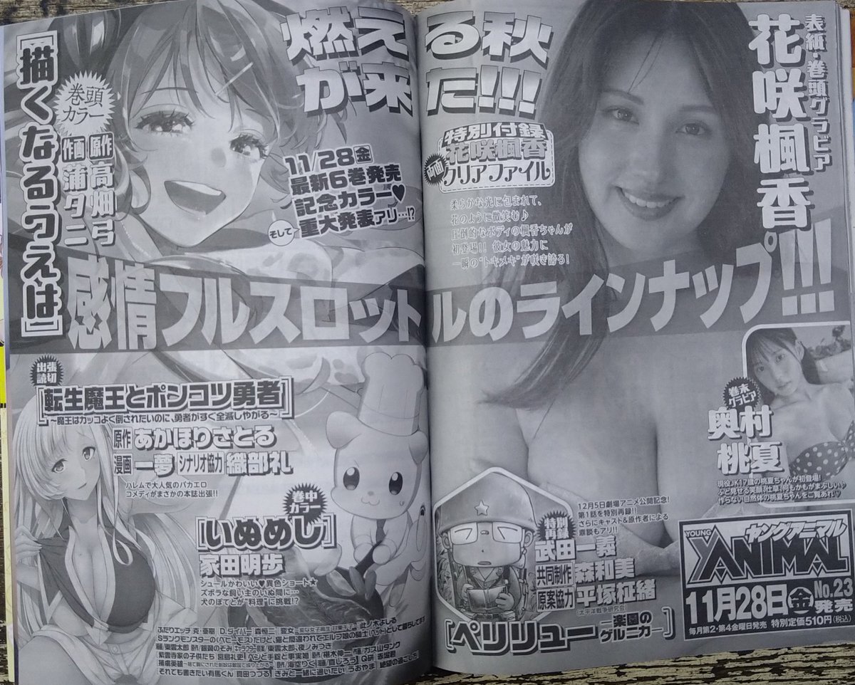 返信先:@Hanasaki__Fuka今日発売のヤングアニマルを買ってきたら、いた。 次は、ヤングアニマル。 11月28日発売。 両面クリアファイルつき。 #花咲楓香 #ヤングアニマル #11月28日(金) pic.x.com/sz3MHCtLgq