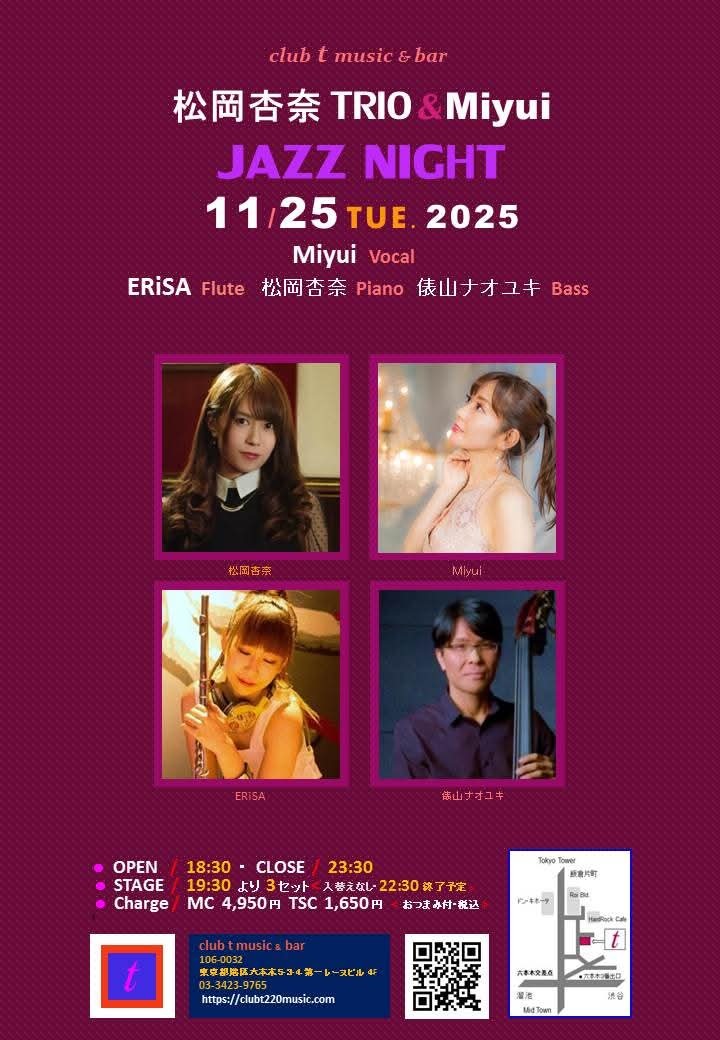来週はこちら🩷 11/25(火)六本木クラブT Vo Miyui Pf 松岡杏奈 Fl Erisa B 俵山ナオユキ 19:30~(3セット) clubt220music.com 11/28(金)馬車道チャーリーズバー Vo Charlie 森林真知子 Miyui Pf 菊地雅之 B 吉川大介 19:30~/20:45~/22:00~ nowonmusic.com/members/478