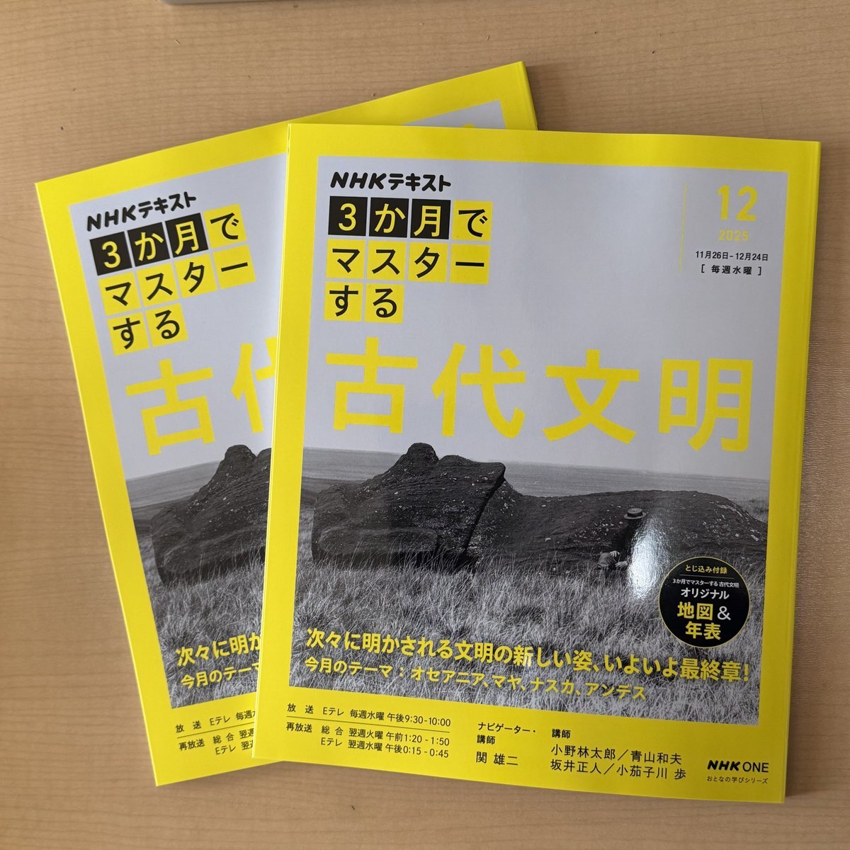 3マス古代文明、ついに最終12月号テキストの見本誌が届いた。 オセアニア、マヤ、ナスカ、アンデスという、最後のラスボス的な内容。 夏も秋も吹っ飛ばして頑張った甲斐のある本になったと思う。 📺放送が楽しみ。 #3か月でマスターする古代文明 pic.x.com/QxlwkgTIyN