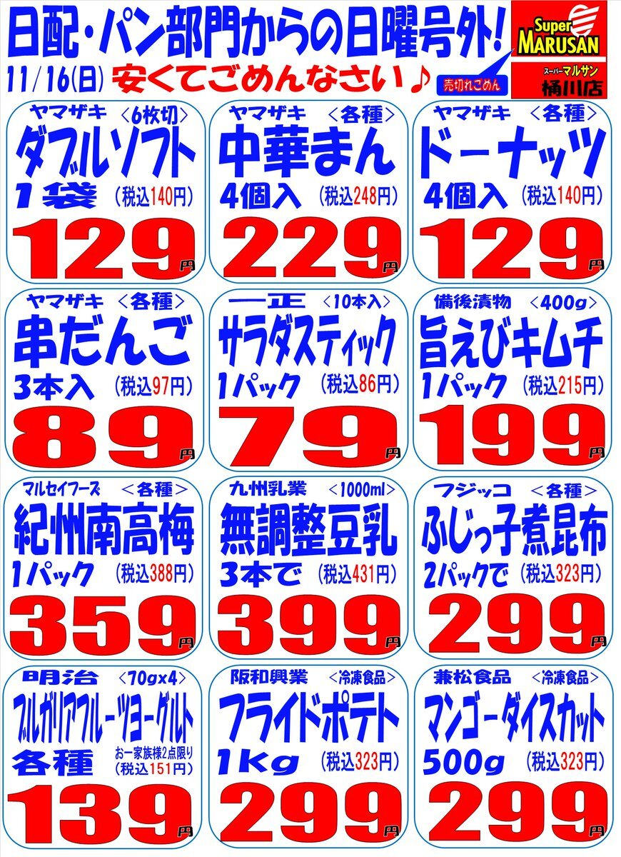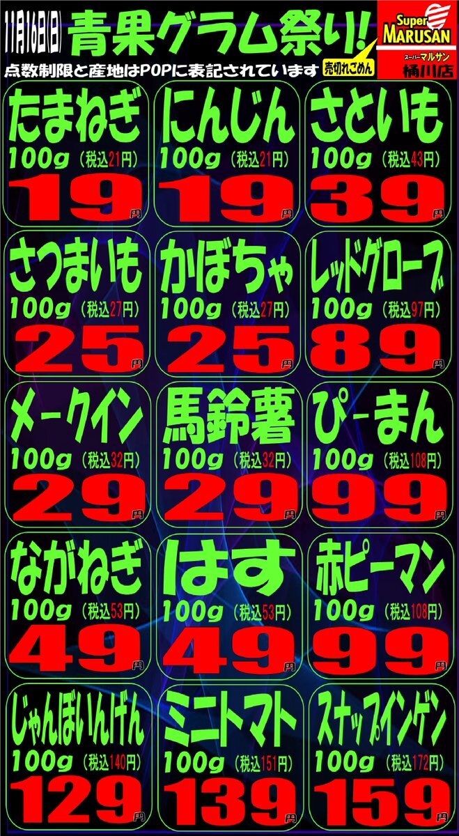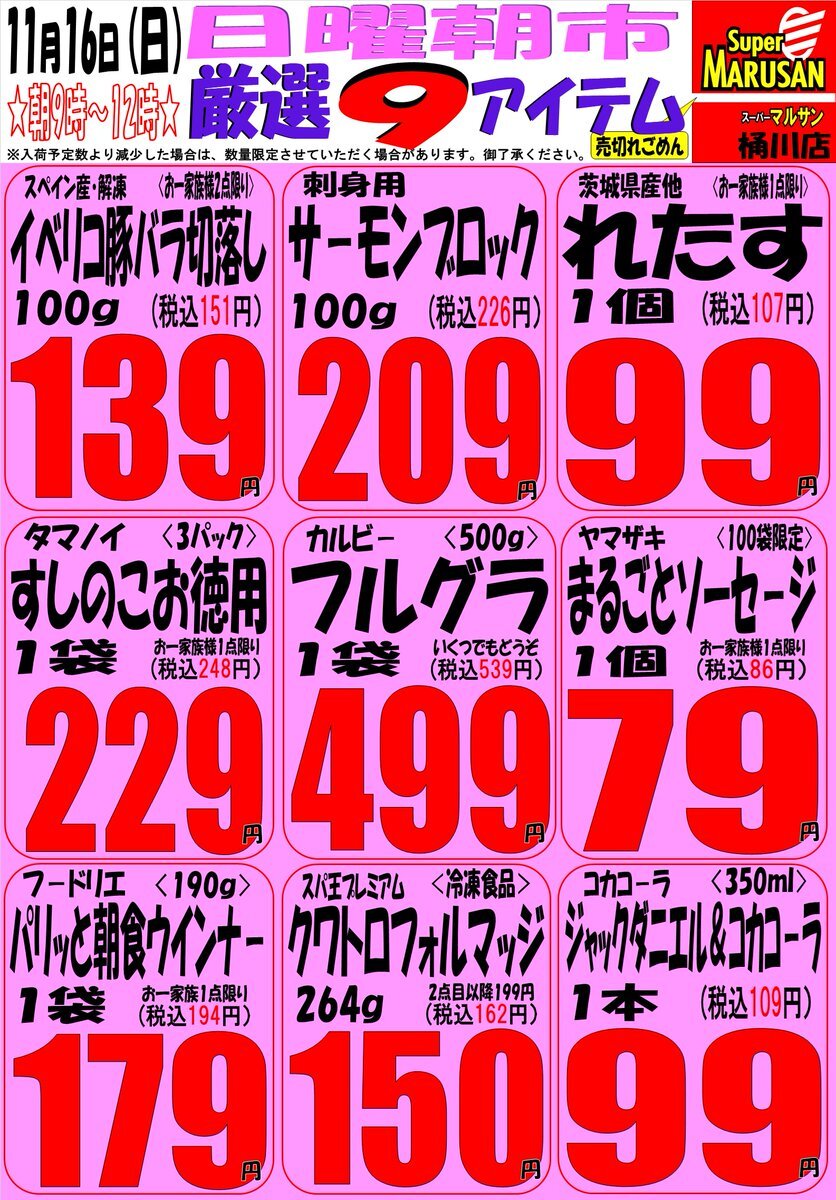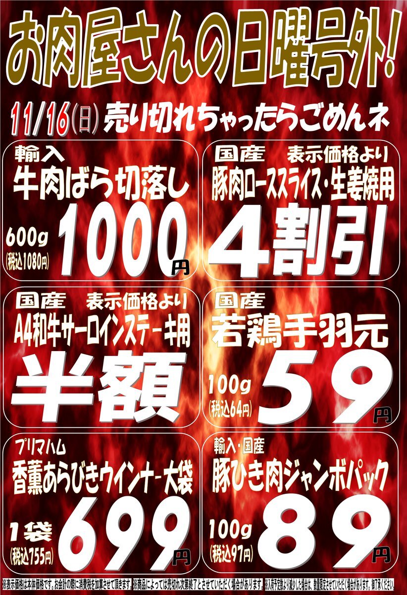 #日曜朝市 #青果グラム祭り #3時のタイムサービス #生鮮祭り #食品菓子の日 11.16(日)早朝タイムサービス「日曜朝市」と青果部、精肉部の号外チラシのご案内です♪ pic.x.com/DcMaQ9a9I5