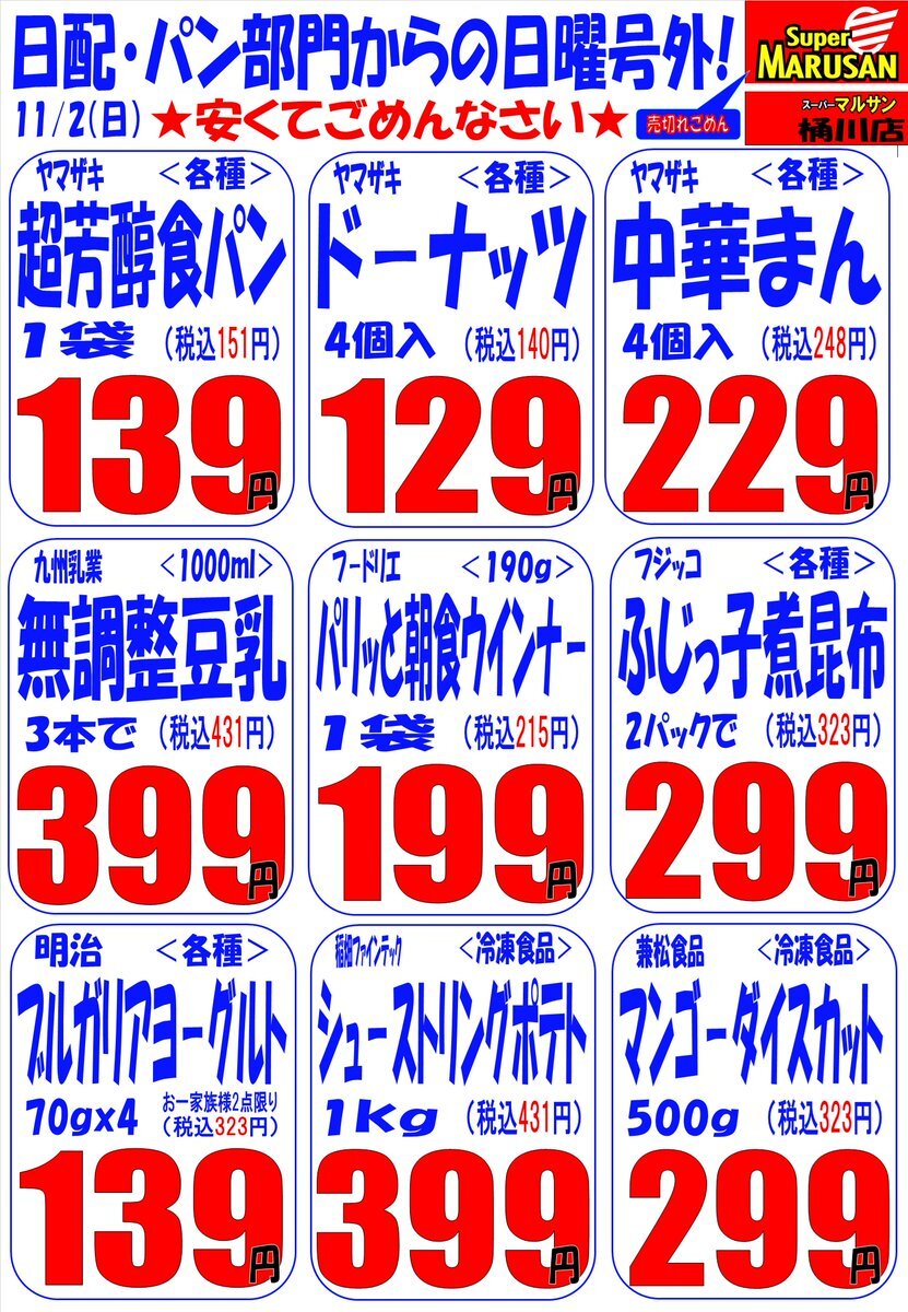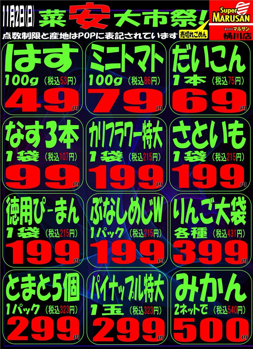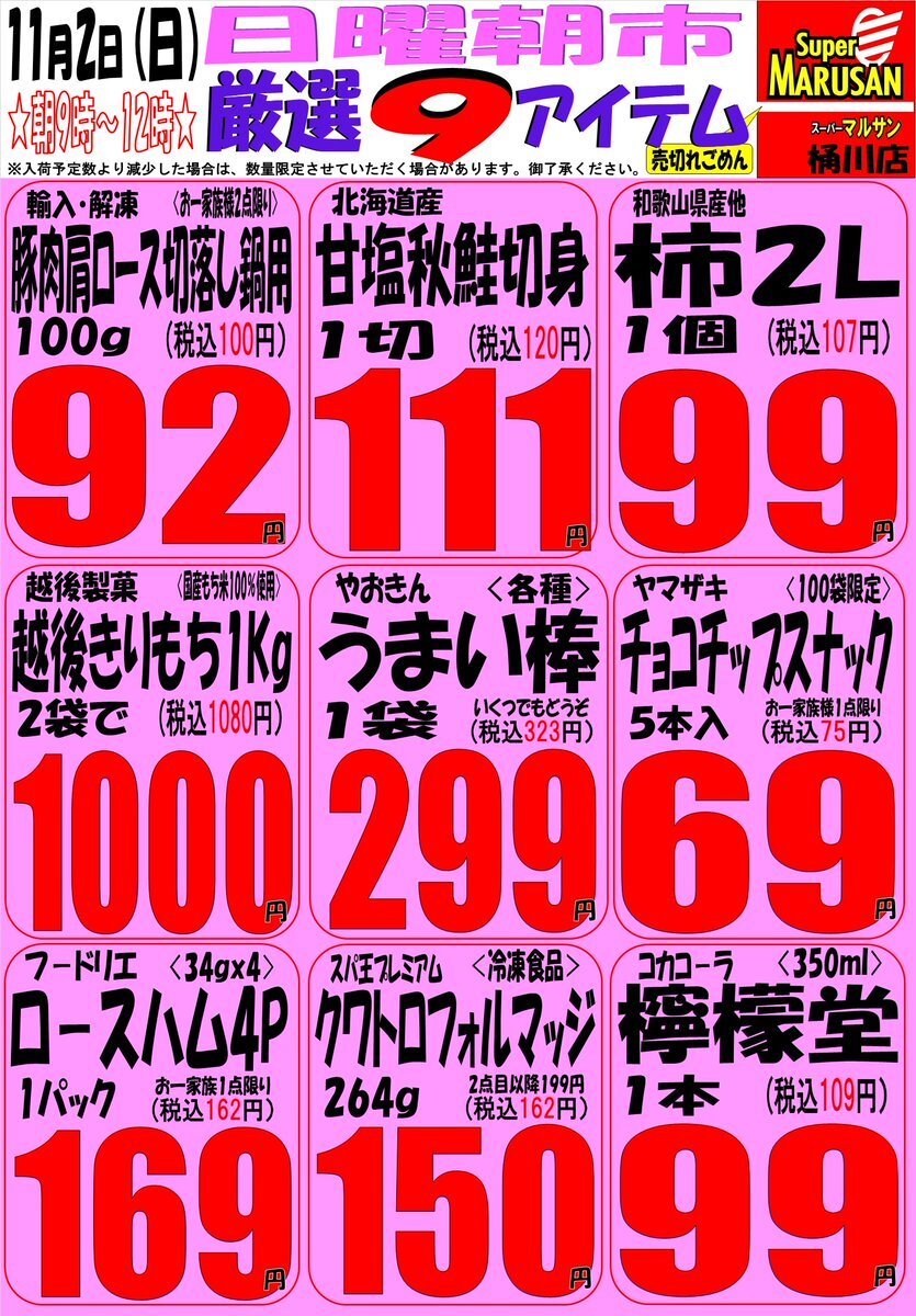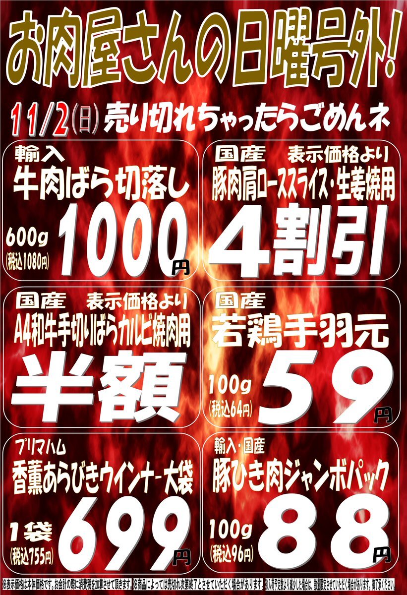#日曜朝市 #3時のタイムサービス #牛乳特売デー #生鮮祭り #食品・菓子の日  11.2(日)チラシに載せきれなかったお買い得品です(*‘∀‘) pic.x.com/86dxB09kvn