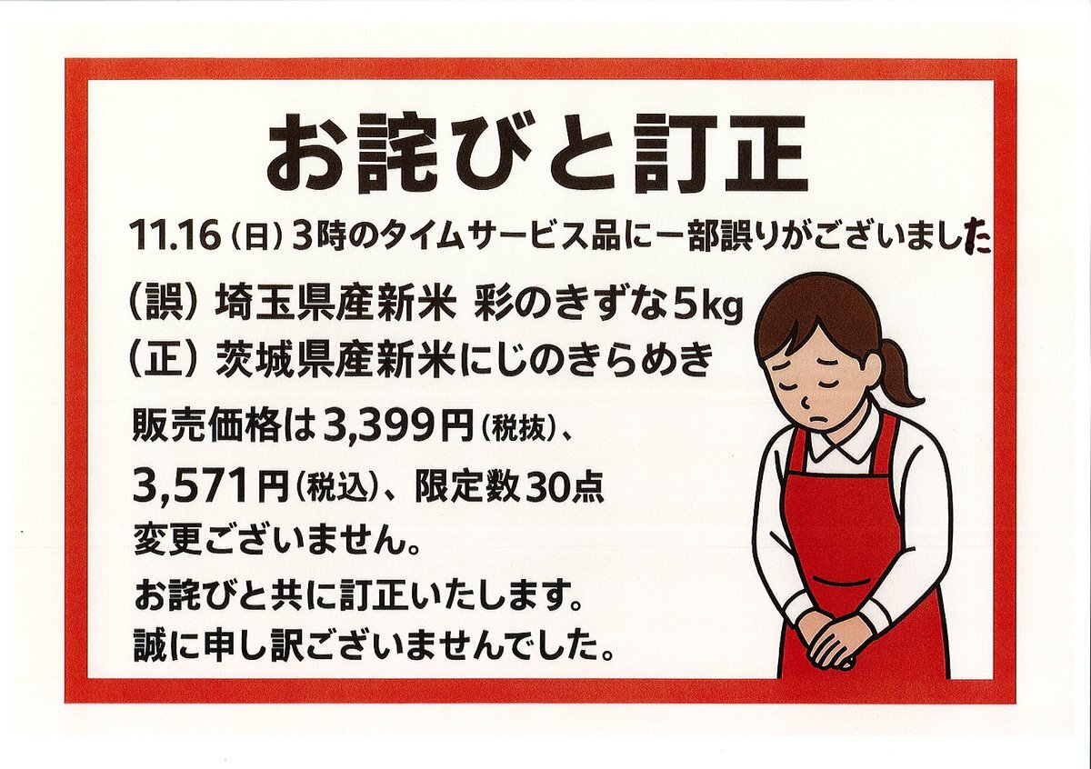 #日曜朝市 #青果グラム祭り #3時のタイムサービス #生鮮祭り #食品菓子の日 11.16(日)の3時のタイムサービスのお米についてチラシ掲載品に一部誤りがございました。銘柄変更のお詫びと訂正をいたします。その他日配・パン部門とお米・酒部門より号外チラシのご案内です(*‘∀‘) pic.x.com/tA3GhAFrGR