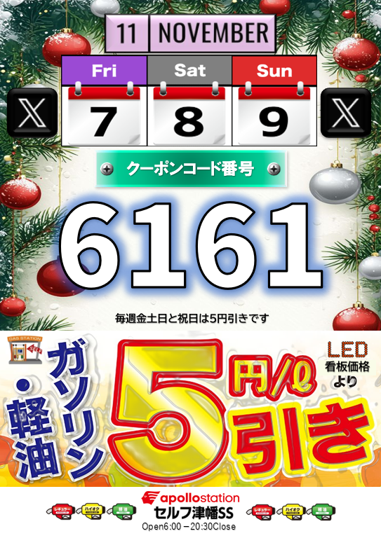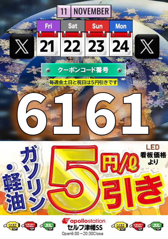 11/21(金)6:00~11/24(祝)20時30分までガソリン・軽油5円/ℓ引きクーポンコード「6161」がご利用頂けます。タイヤのお問合せまたオイル交換・KeePerコーティング・車検の予約受付中 #津幡石油 #ガソリン #クーポン #5円引き #タイヤ #オイル #Keeper #車検 #DriveOn #配達 #灯油 #Pitin pic.x.com/bonyrjQvgG