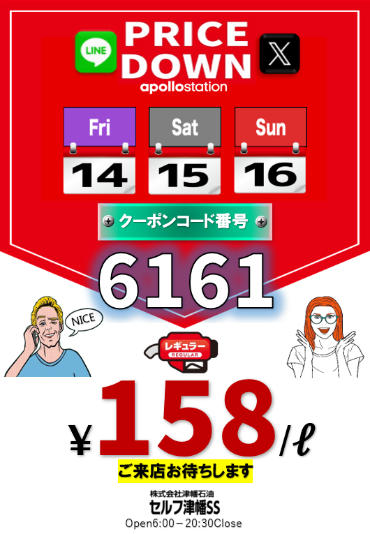 11/14(金)6:00~11/16(日)20時30分までガソリン・軽油5円/ℓ引きクーポンコード「6161」がご利用頂けます。タイヤのお問合せまたオイル交換・KeePerコーティング・車検の予約受付中 #津幡石油 #ガソリン #クーポン #5円引き #タイヤ #オイル #Keeper #車検 #DriveOn #キッチンカー #配達 pic.x.com/ygcw4Mzg1D
