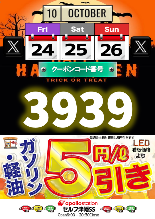 10/24(金)6:00~10/26(日)20時30分までガソリン・軽油5円/ℓ引きクーポンコード「3939」がご利用頂けます。タイヤのお問合せまたオイル交換・KeePerコーティング・車検の予約受付中! #津幡石油 #ガソリン #クーポン #5円引き #タイヤ #オイル #Keeper #車検 #早割 #DriveOn #保管 pic.x.com/azpbNgsfrw
