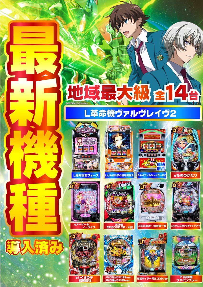 明日4日(火)朝9時開店☀️ 👑新台入替👑 最新台導入‼️ #L革命機ヴァルヴレイヴ2 3台 #PReゼロから始める異世界生活鬼がかり199ver 2台 #e花の慶次~黄金の一撃 1台 #eルパン三世VSキャッツアイ 1台 #eフィーバーもののがたり 1台 ※新台は朝からご遊技出来ます。 pic.x.com/QsHRnZtt4D