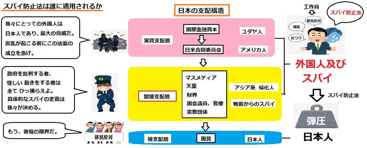 スパイ防止法に反対する奴はスパイ。このセリフを言う人、もれなく無知なアホか工作員のどちらかですのでお気をつけ下さい。この国を外国勢から守るためと言いますが、そもそも、この国は既に外国人に乗っ取られているのです。彼らがこの法案を誰に対して適用するのかは、言わずともわかりますよね。
