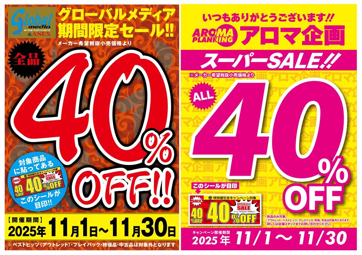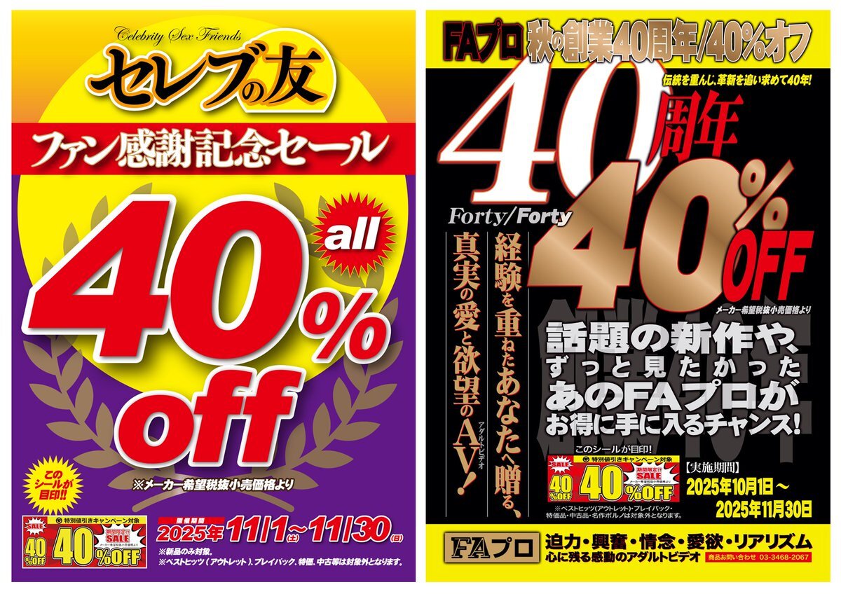 #DVD販売 #おとなのおもちゃ販売 11/9 日曜日は 2つのキャンペーンを開催中 今月は #FAプロ #セレブの友 #アロマ企画 #グローバルメディア #バレマン #ブロッコリーグループ が40%OFF 熟女・人妻キャンペーン #Madonna #溜池ゴロー が20%OFF ご来店お待ちしております pic.x.com/FBQ7XP0des