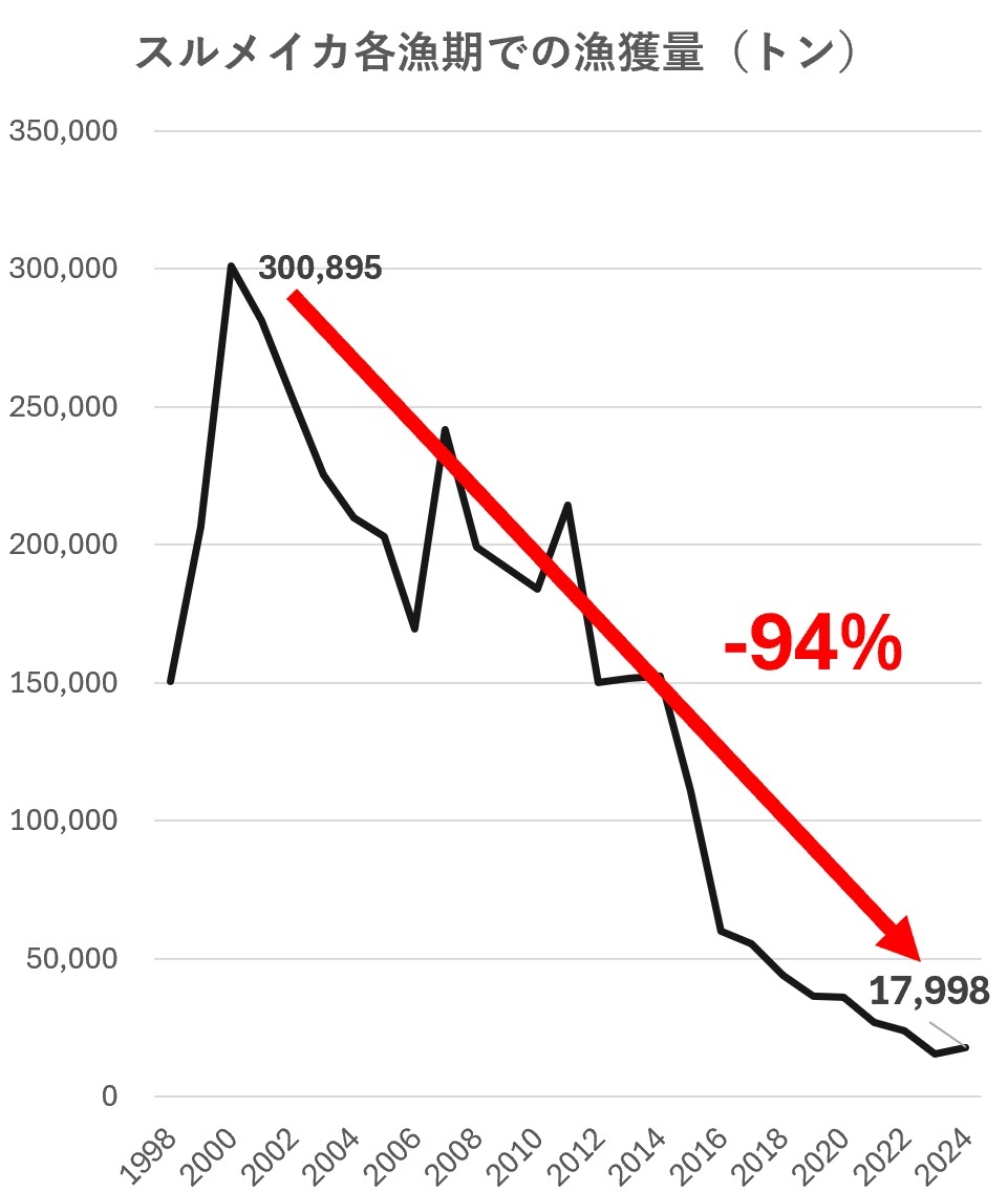 「たくさん獲れている!」「もっと獲らせろ!」と再々増枠予定のスルメイカ。現実は資源量は限界管理基準値を下回っており、漁獲量の推移はこんな感じ。ちょっと獲れだしたイカを根こそぎ獲ろうとするとは、さすが日本の資源管理は世界一です