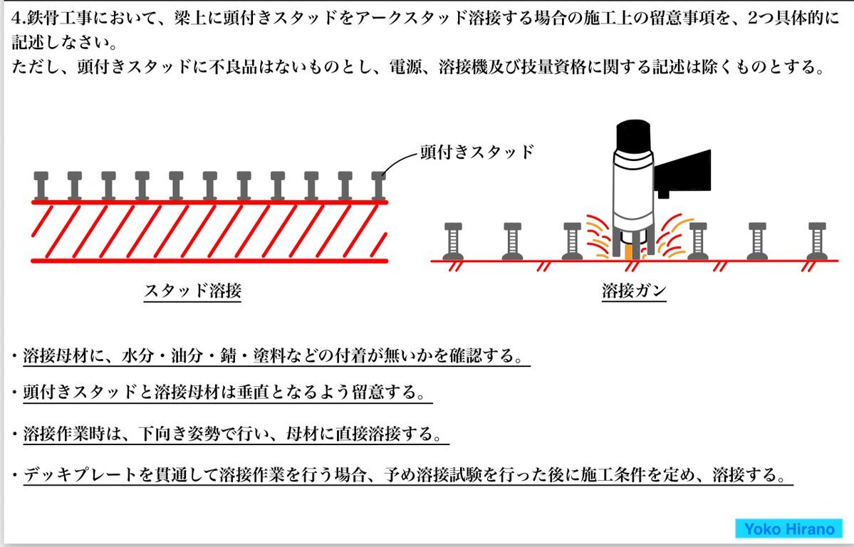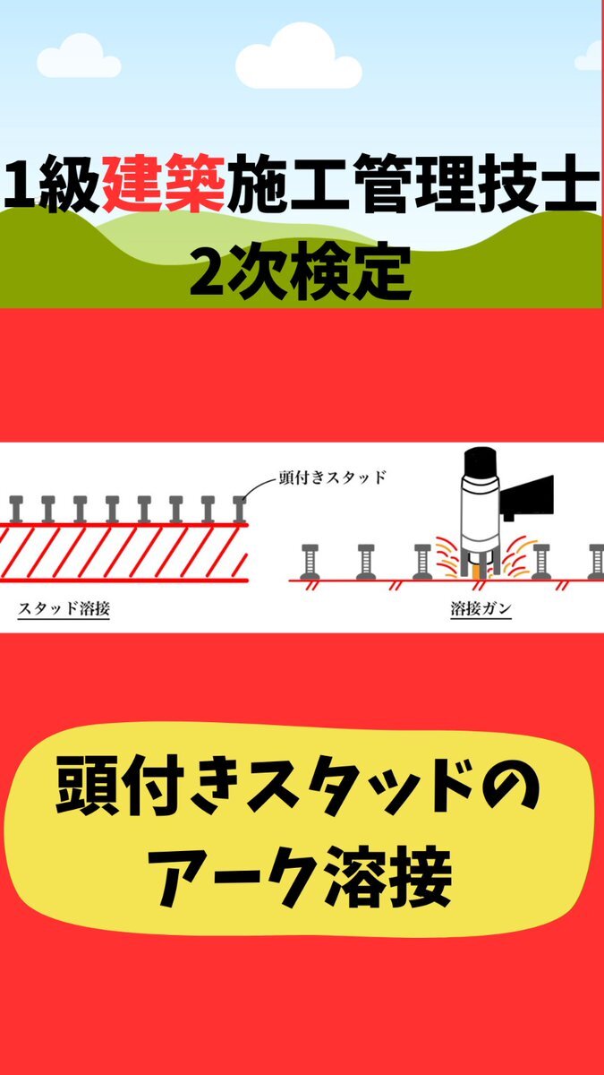 ◆頭付きアークスタッド溶接の施工上の留意事項 溶接母材に、水分・油分・錆・塗料などの付着が無いかを確認する。 ↓【YouTube shorts解説】 youtube.com/shorts/XWXW3Us… #1級建築施工管理技士 #2次検定 #建築 #建築施工 #鉄骨 #鉄骨工事 #スタッド溶接 #頭付きスタッド #溶接 #溶接ガン pic.x.com/SnSBsrIJQy
