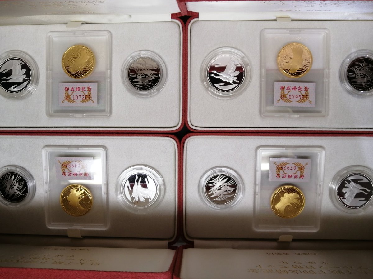 金の価格が跳ね上がって、今日現在の天皇陛下御即位記念10万円金貨の買取価格653,900円、皇太子殿下御成婚記念5万円金貨の買取価格392,300円、各4枚ずつあるので、合計4,184,800円 いつ売るかマジで迷う…🤔 #資産運用 #金相場 #10万円金貨 #5万円金貨 pic.x.com/mYnxQ8atPh