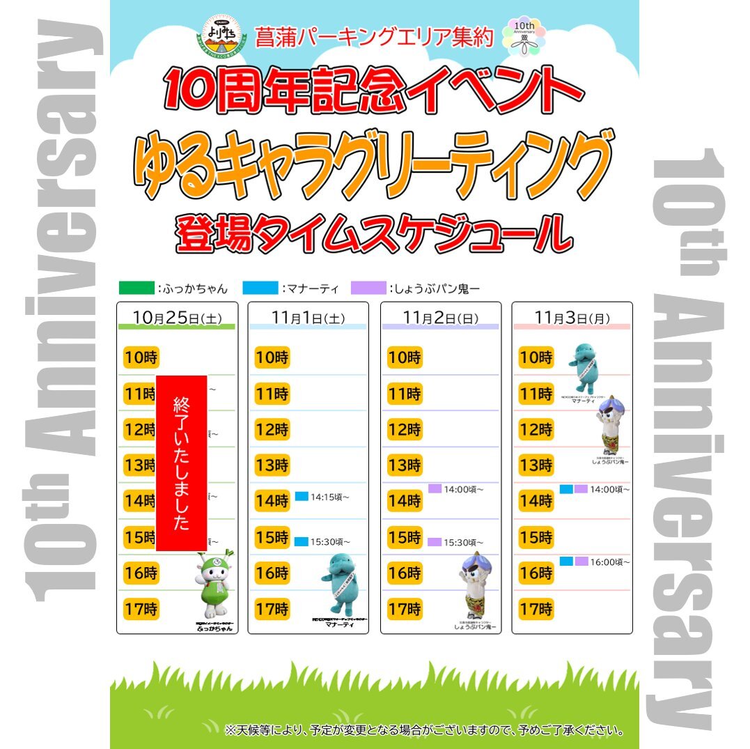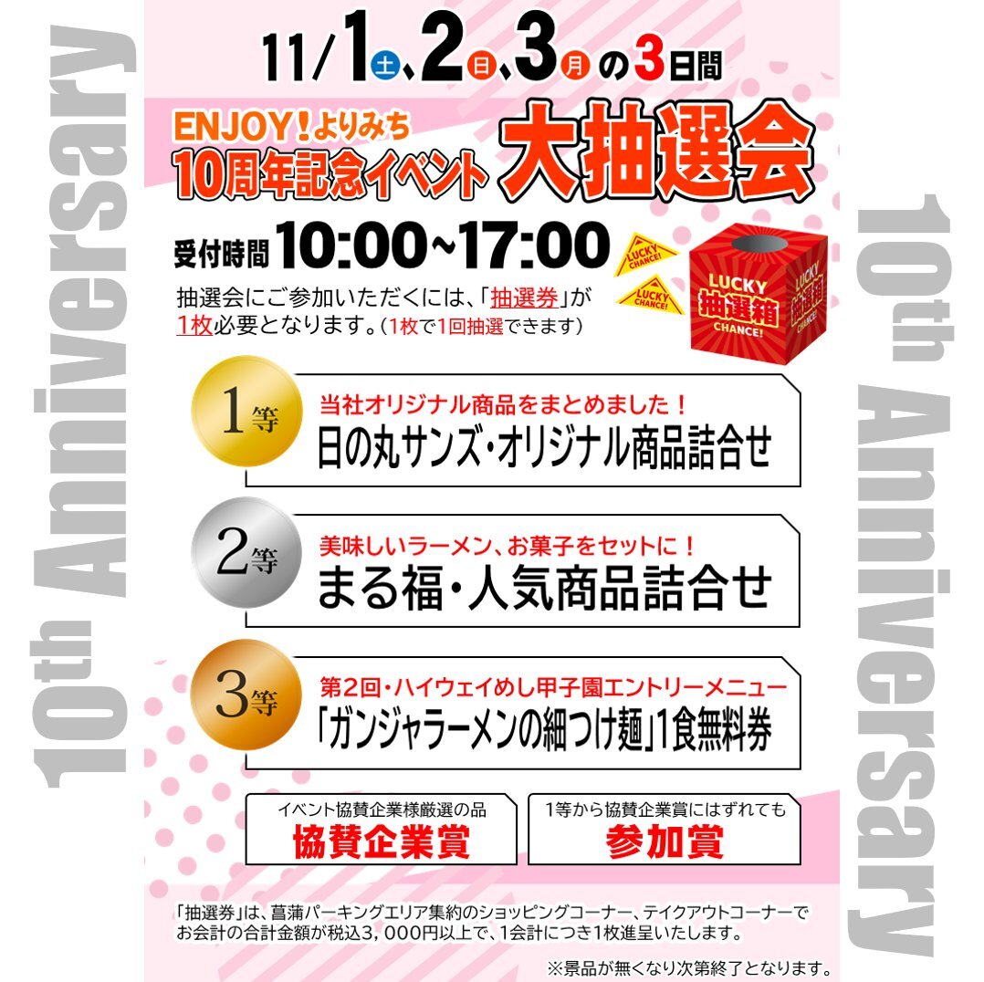 ☆★おかげさまで10周年★☆ 11月1日(土)~11月3日(月)の3日間は、10周年記念イベントラスト3日間!! みなさまのお越しをお待ち申し上げております。 #10周年記念 #マナーティ #抽選会 #イベント #景品 #ENJOYよりみち #菖蒲pa #菖蒲パーキングエリア #圏央道 pic.x.com/RHmGxJGAS1