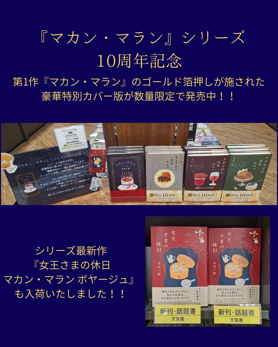 【BOOK】オススメ本&新刊情報🎉 #古内一絵  『 #マカンマラン 』シリーズ #10周年記念 第1作目の豪華特別カバー版が発売中😊 店内奥の文芸書コーナーにて展開中 さらにシリーズ最新作『 #女王さまの休日 』 も発売中✨ #TSUTAYA植木店 #オススメ本 #新刊紹介 #中央公論新社 x.com/gunei19/status… pic.x.com/xPkPt4vZnM