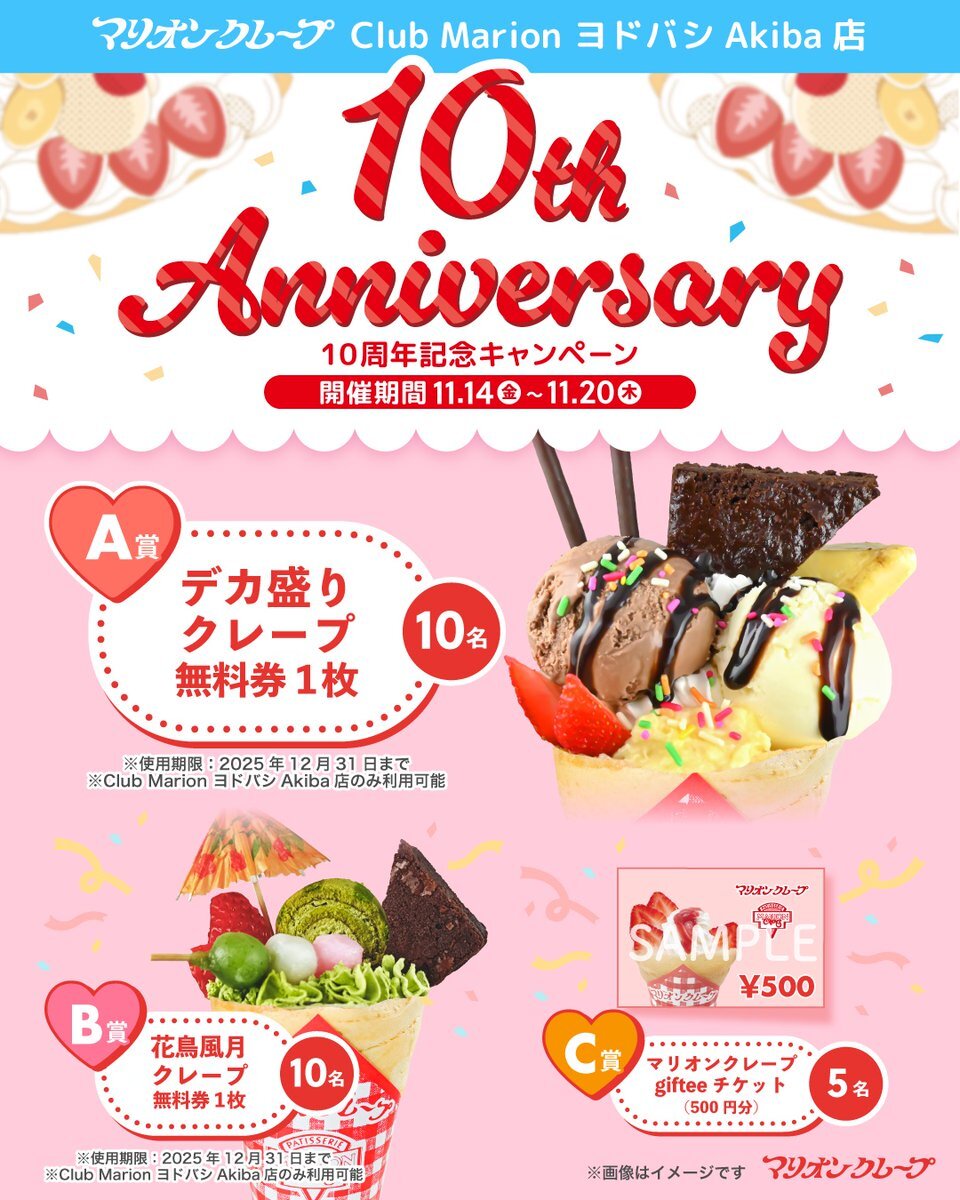 / #マリオンクレープ Club Marion ヨドバシAkiba店 10周年記念🎉⸝ \ フォロー&リポストで Club Marion ヨドバシAkiba店の 人気クレープをプレゼント🎁✨ 【応募方法】 ① @marion_japan をフォロー ② この投稿を引用リポスト🔁 ⏰11/20 23:59まで