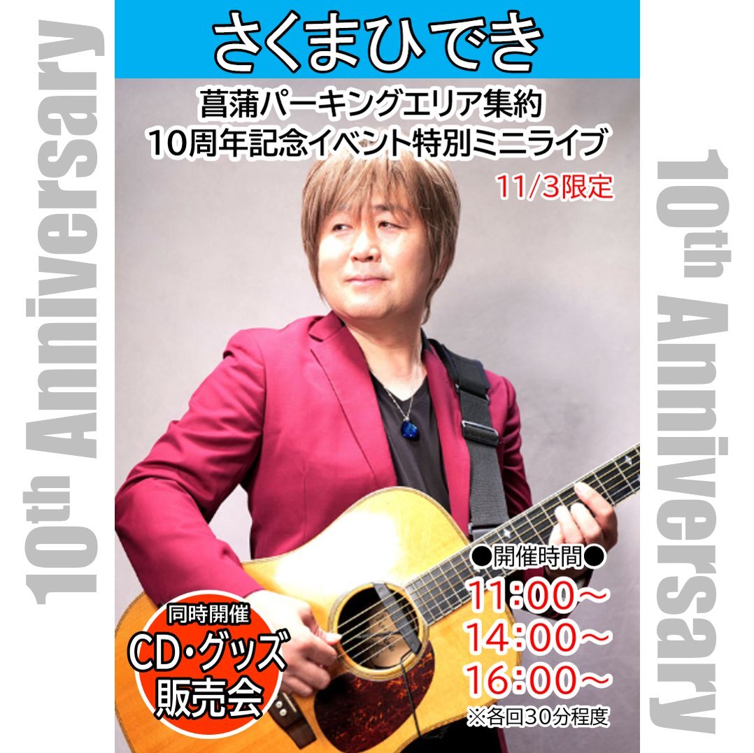 ☆★おかげさまで10周年★☆ 10周年記念イベント最終日の11月3日(月)は、鴻巣市出身の歌手・さくまひできさんによるミニライブを開催!! #10周年記念 #さくまひでき #ミニライブ #イベント #ENJOYよりみち #菖蒲pa #菖蒲パーキングエリア #圏央道 pic.x.com/1jPVouovoz