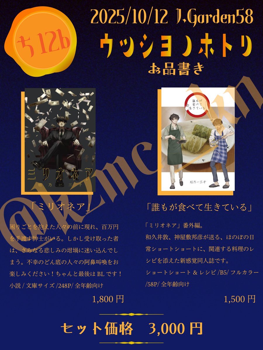 【お知らせ】 #J庭58 にサークル参加します! 百万配って人を不幸にする男の話「ミリオネア」と、その後のショートショートを集めた「誰もが食べて生きている」、その他短編集や無配ポストカード、セット購入特典など色々ありあまる小説サークル。よしなに! #J庭 #創作BL #創作BL小説 #ホラーBL