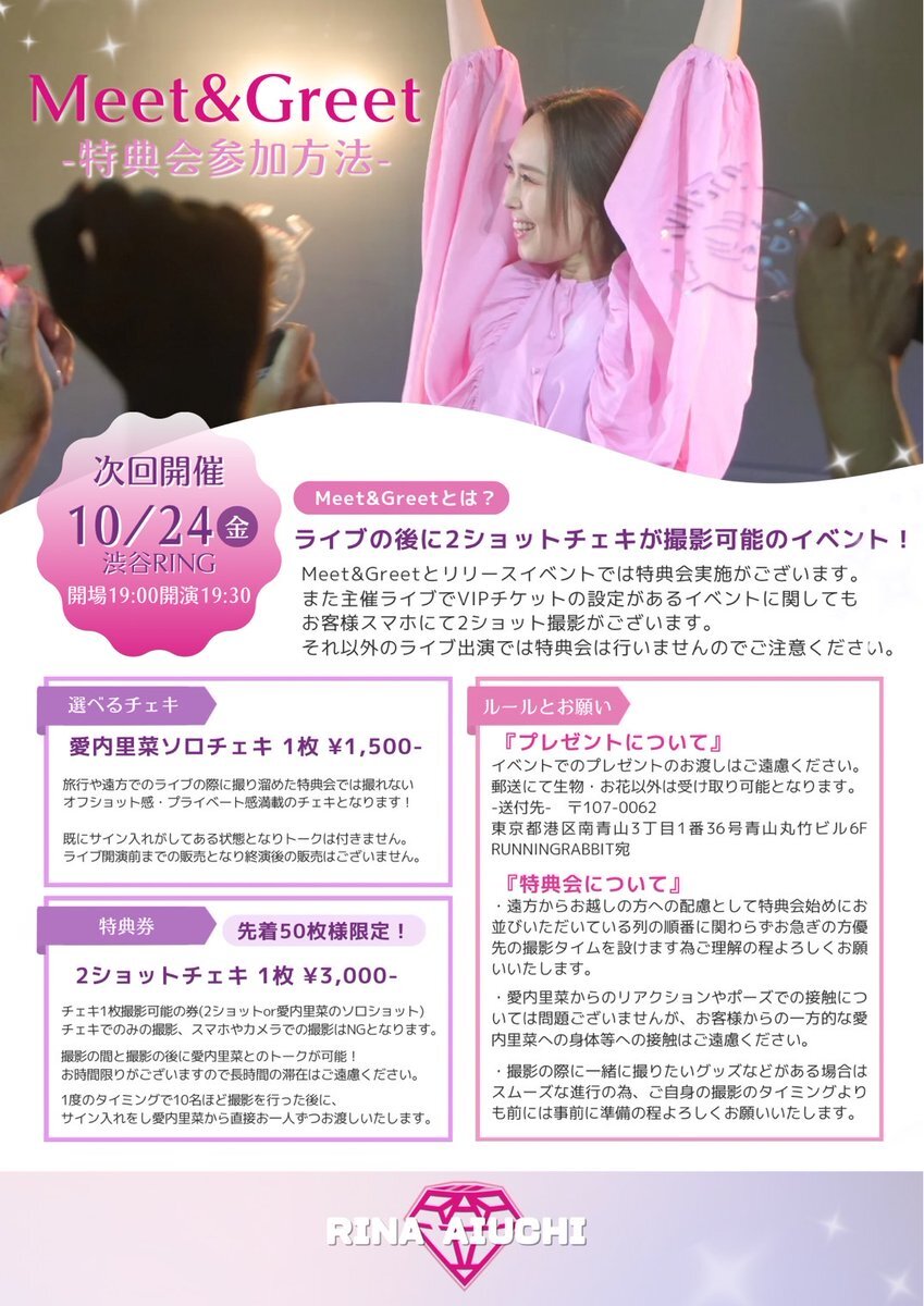 本日 10月24日(金)はミーグリライブ‼️ @渋谷RING 19:30開始 当日券あります。 開場時間に直接受付までお越しください。 rinaaiuchirr.jp/event/2510rbox…
