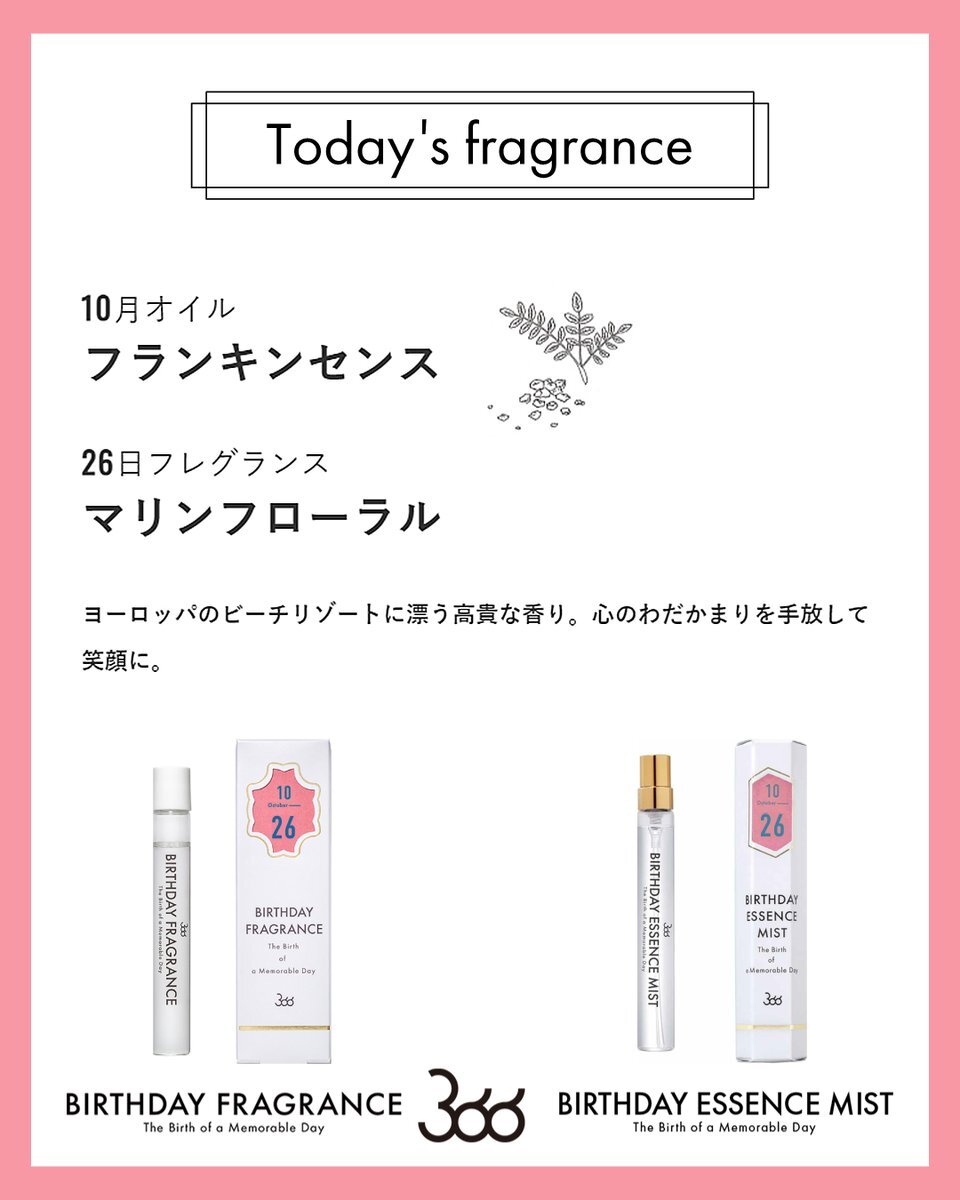 今日10月26日の香りは… 月のオイル: #フランキンセンス 日の香り:#マリンフローラル ヨーロッパのビーチリゾートに漂う高貴な香り。心のわだかまりを手放して笑顔に。 #バースデーフレグランス #10月生まれ #誕生日香水 🎁SHOP🎁 f-room.shop/pages/366 pic.x.com/z3qolNuO6L