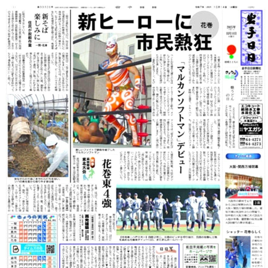 きょう(10月14日)の岩手日日1面トップは「マルカンソフトマン」デビュー! iwanichi.co.jp/2025/10/14/158… 📰📱詳報はきょうの紙面、電子新聞momottoで #岩手県 #花巻市 #マルカンビル大食堂 #10段ソフトクリーム #コラボ #みちのくプロレス pic.x.com/yyRr2RzosQ
