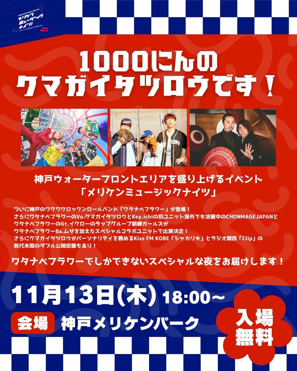 \1000にんのクマガイタツロウです!/ 11.13(木)@ 神戸メリケンパーク 18:00スタート!入場無料🆓 神戸ウォーターフロントエリアを盛り上げるイベント「#メリケンミュージックナイツ」に #ワタナベフラワー が登場! Kiss FM KOBE「#シャカリキ」と #ラジオ関西「Clip」のダブル公開収録も!
