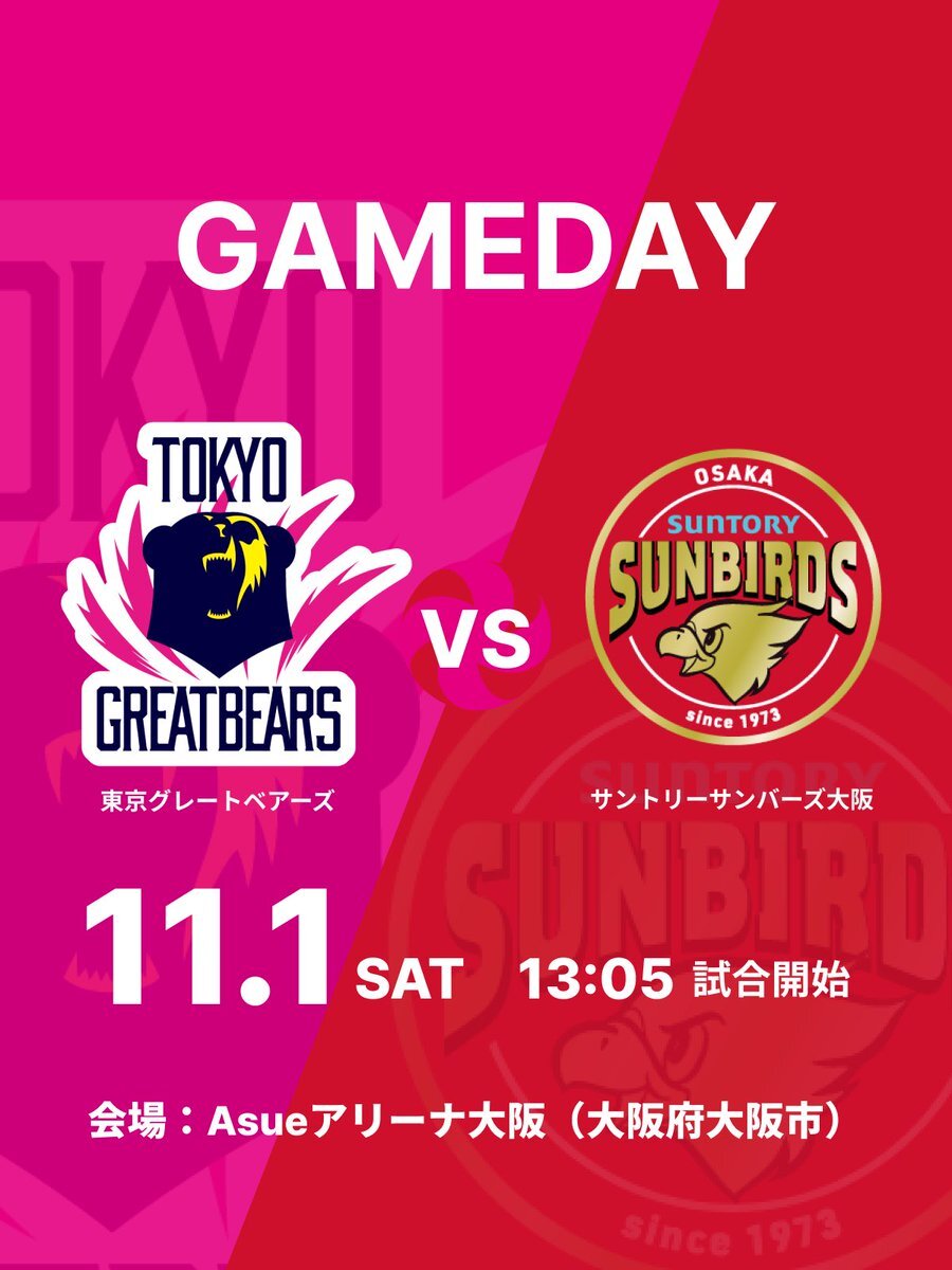 ⭐️GAME DAY⭐️ ⏰ 11/1(土)13:05 🆚 #サントリーサンバーズ大阪 📍 Asueアリーナ 👕 ネイビー(L:ピンク) 📺 JSPORTS & GAORA SPORTS 今週も盛り上がっていきましょう🐻🔥 本日はシアターライブビューイングです! #109シネマズプレミアム新宿 からもエールを送りましょう📣 pic.x.com/CBbCVg729E