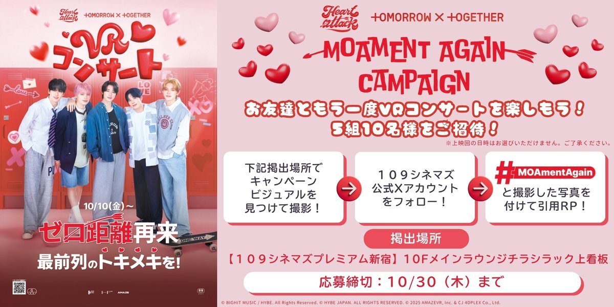 10/10(金)〜上映中🎬 『#TXT #VRコンサート』 💘 𝐌𝐎𝐀𝐦𝐞𝐧𝐭 𝐀𝐠𝐚𝐢𝐧 𝐂𝐚𝐦𝐩𝐚𝐢𝐠𝐧 💘 お友達ともう一度、VRコンサートを楽しもう! 抽選で5組10名様をVRコンサートにご招待💌 ※こちらで指定日時でのご招待となります。 ❤️応募方法❤️ 1️⃣ #109シネマズプレミアム新宿