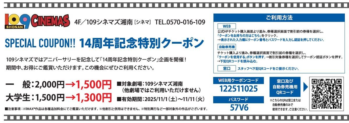 ✨祝!テラスモール湘南14周年🎊 109シネマズ湘南 特別割引クーポン🎁 #テラスモール湘南 14周年を記念いたしまして、 #109シネマズ湘南 で期間中何度でもご利用頂ける 特別割引クーポンを発行いたします📽️🎟️ 【割引内容】 一般 2,000円 → 1,500円 大学生1,500円 → 1,300円 pic.x.com/NveDlnlmtg