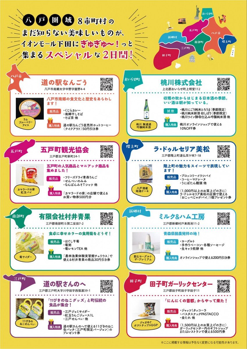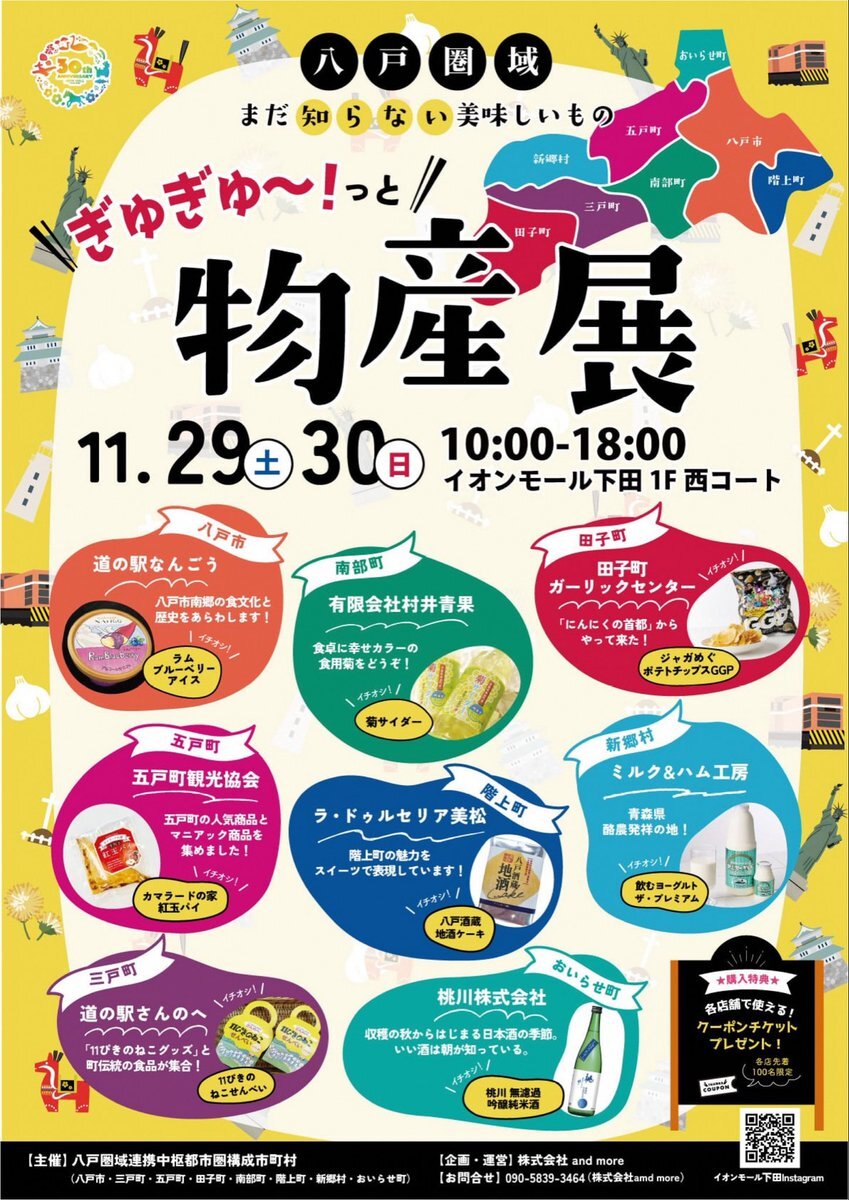 11月29日(土)・30(日) にイオンモール下田1F西コートで八戸圏域物産展が開催されます!!三戸町からは、三戸ジョミサイダーや紅玉りんごジュース、さんのへせんべいなどを出品します!ご家族やご友人とお越しください!! #三戸町 #11ぴきのねこのまちさんのへ #八戸圏域連携中枢都市圏 pic.x.com/xSwJ0PQu7V