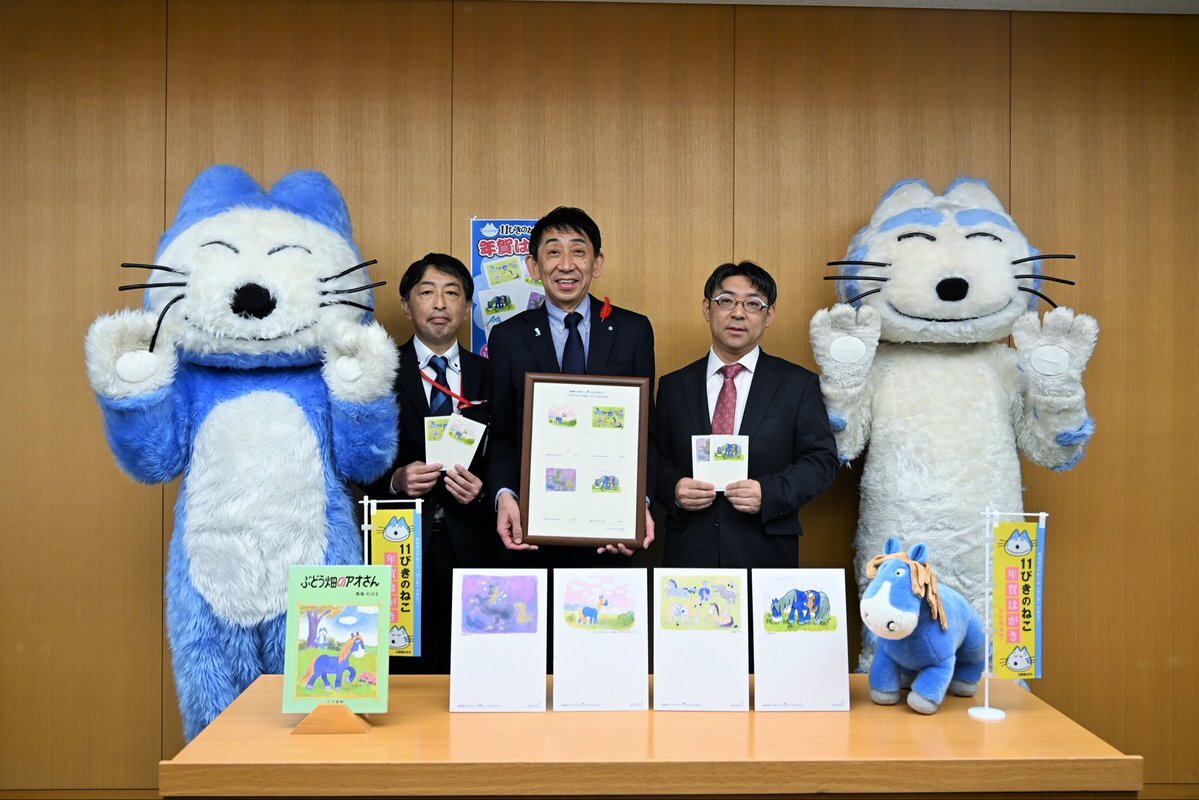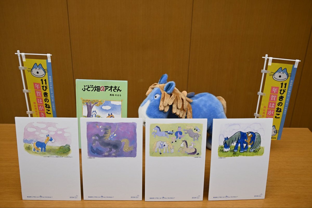 #11ぴきのねこ 」年賀はがきセットが発売されます。今回のデザインは来年の干支「馬」にちなんで、馬場のぼる先生の最後の作品「ぶどう畑のアオさん」や、かわいらしい馬のイラストです。4絵柄1セットで11月1日発売です。ぜひお早めにお買い求めください。 #三戸町 #11ぴきのねこのまちさんのへ pic.x.com/J5Wemo6ic1