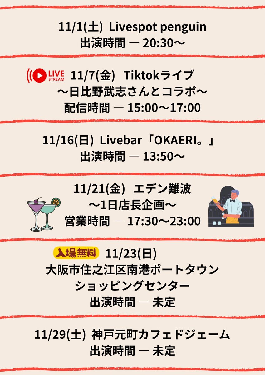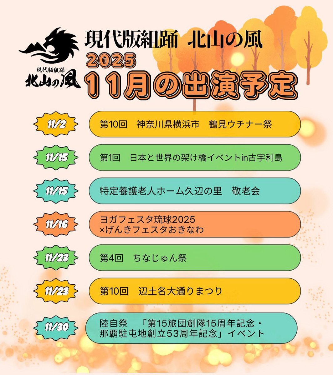 11月の出演予定です! 鶴見ウチナー祭は終わりましたが、この後もまだまだ、イベント続きます! 応援よろしくお願いします🥺 #現代版組踊北山の風 #北山の風 #11月の予定 #沖縄 pic.x.com/MqeM84nsMx