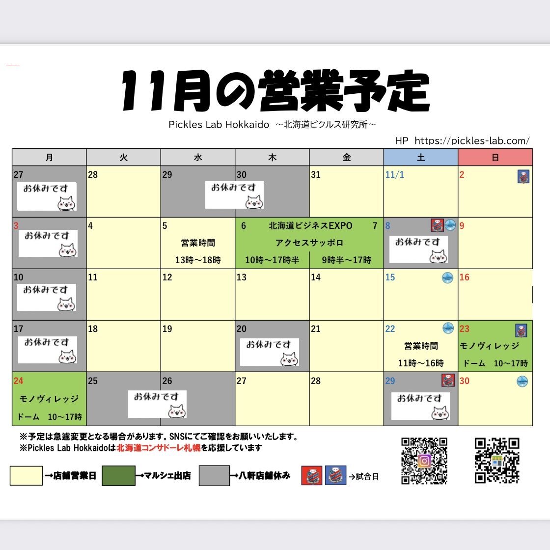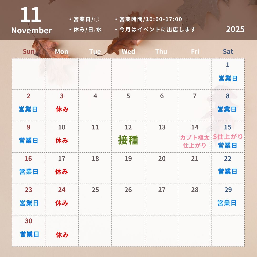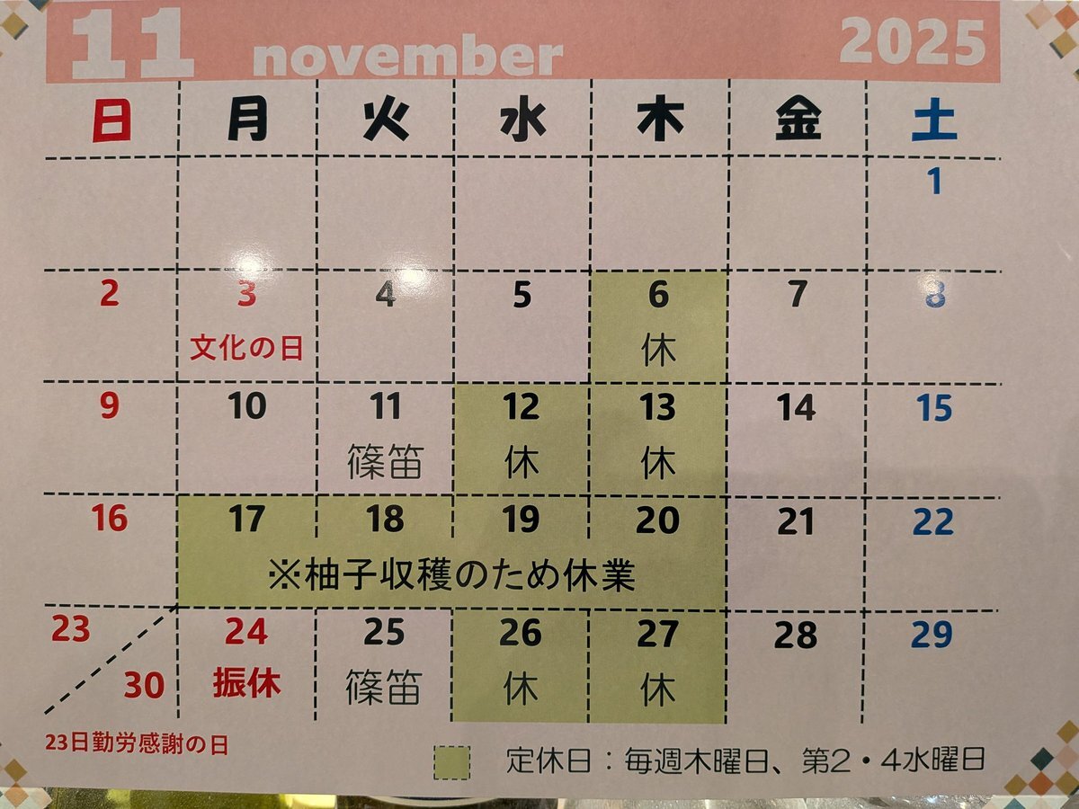 11月の営業予定カレンダーです。 固定ポストにしておきますので、よろしくお願いします。 柚子収穫で月中にお休みをいただきます。 よろしくお願いします🙇 #11月の予定 #お休み #営業予定 #柚子 #柚子収穫 #柚子の季節 #寒くなってきました pic.x.com/i9McSMIVDX