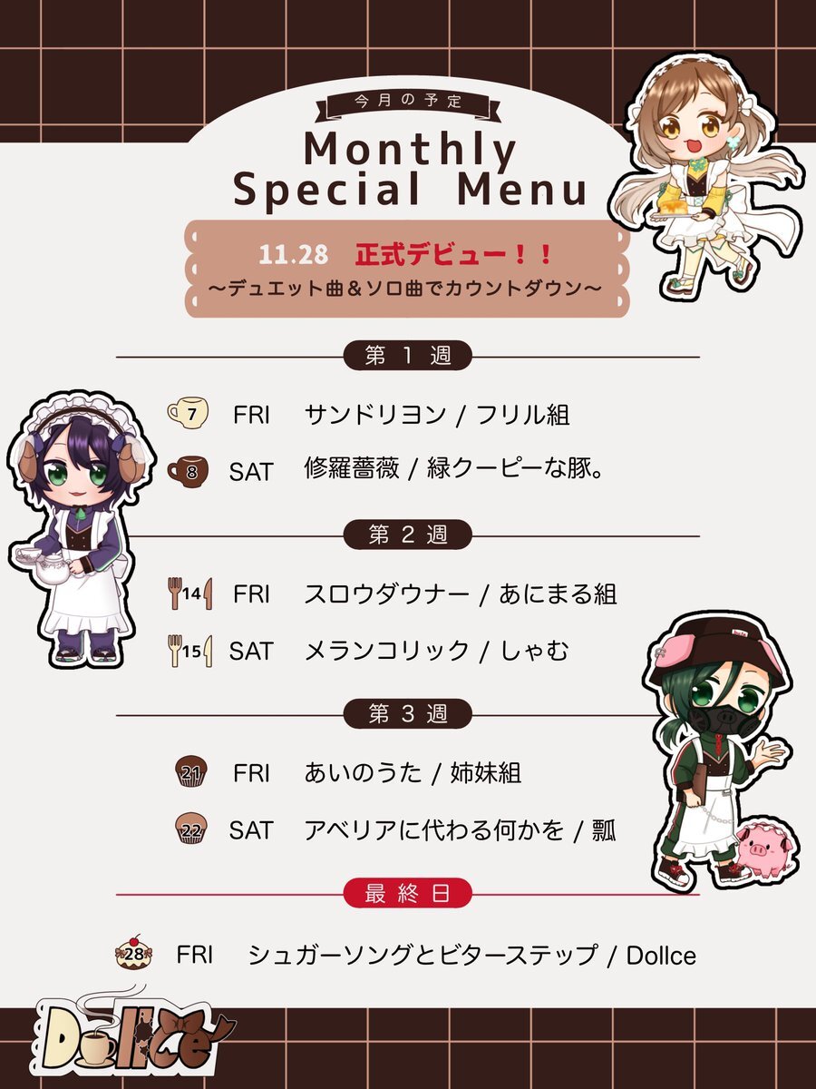 🍁今月のスケジュールはこちら🍁 今月はついに正式デビュー🎉 デュエット曲でカウントダウンを迎えよう‼️ 土曜日にはメンバーの個人チャンネルでソロの歌みたも公開🤎 毎週金曜日はDollceにご来店あれ☕️ #Dollce_ #11月もよろしくお願いします pic.x.com/OwLJfnnmr0