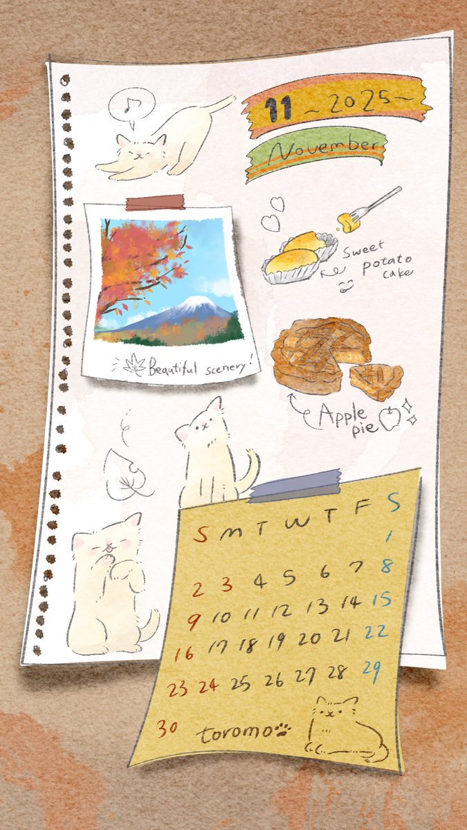 #11月もよろしくお願いします ようやく秋だな~と思ったら…想像以上に寒くてビビってます🥹 ロック画面や待受画面に、個人用としてお使いいただけたら嬉しいです🍁 #イラスト #ゆるいイラスト #カレンダー #カレンダー壁紙 #11月 #illustration #ねこ #絵柄が好みって人にフォローされたい #toromo pic.x.com/0bSxWAJrFS