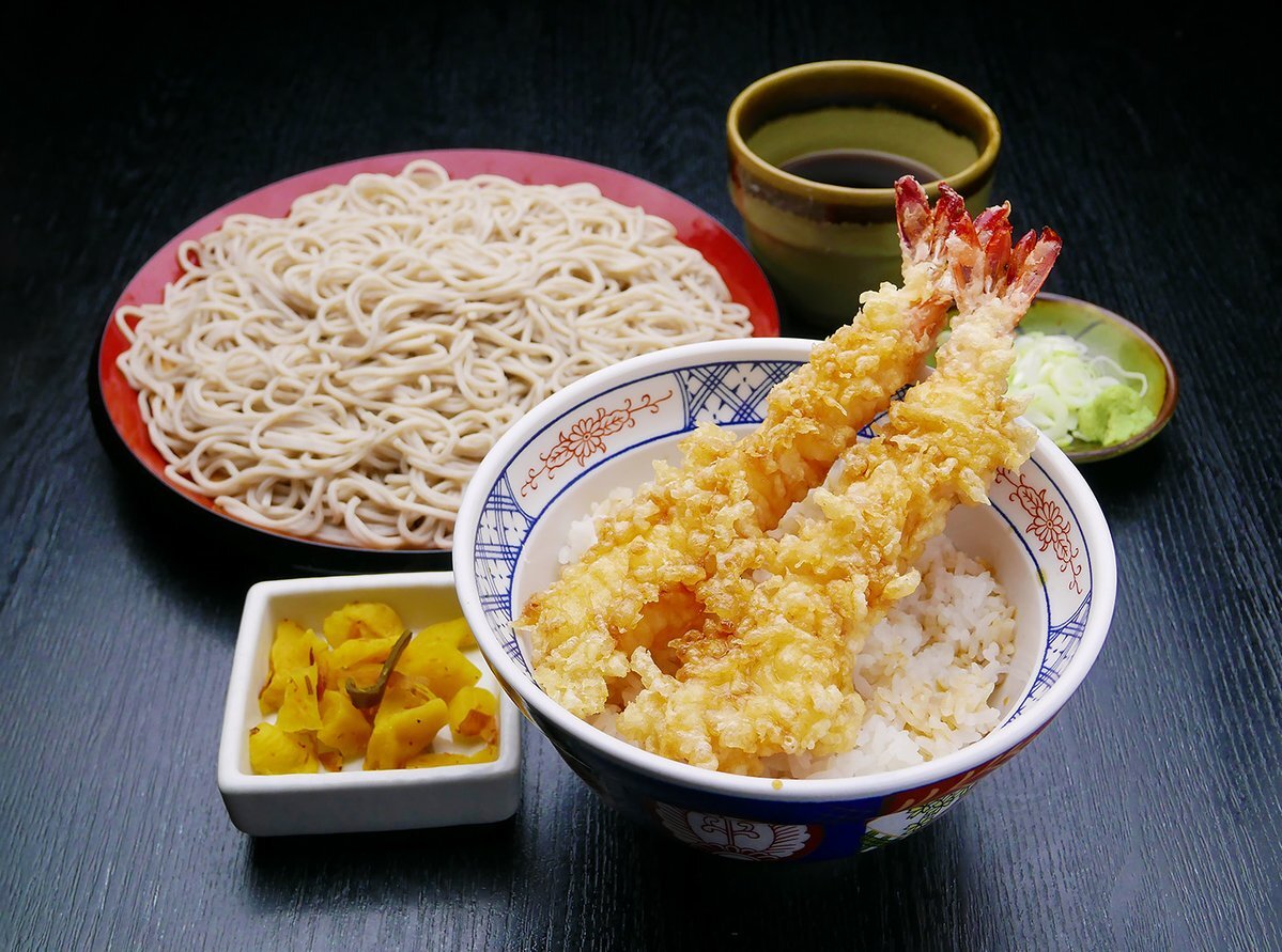 #味奈登庵 の代表メニュー大海老を使用した「海老天ぷら 🍤」 その海老天ぷらを❗️ なんと2本✌️も丼にのせちゃったメニューが「海老天丼」です🤩 大ぶりの海老を豪快に頬張りつつ、タレの染みたご飯でかき込んでください😆 セットなら「そばで1本」「ご飯で1本」楽しめちゃいますよ😋