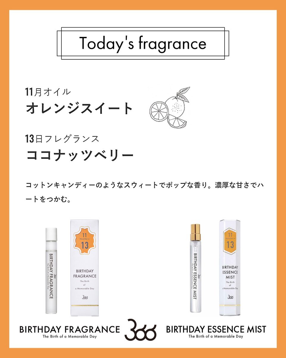 今日11月13日の香りは… 月のオイル: #オレンジスイート 日の香り:#ココナッツベリー コットンキャンディーのようなスウィートでポップな香り。濃厚な甘さでハートをつかむ。 #バースデーフレグランス #11月生まれ #誕生日香水 🎁SHOP🎁 f-room.shop/pages/366 pic.x.com/b3TnJcmsZ8