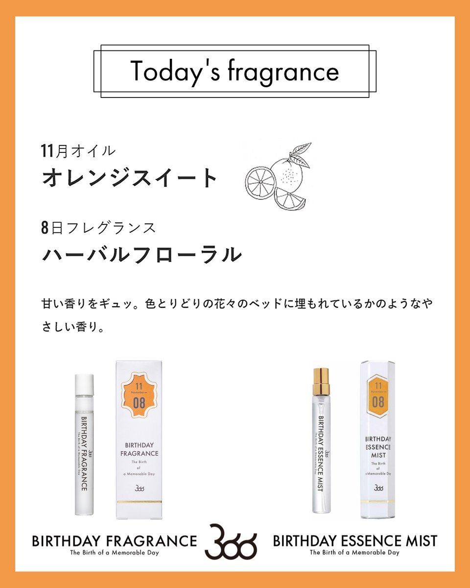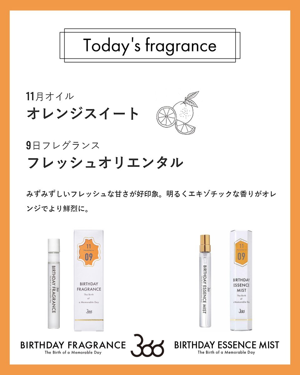 今日11月9日の香りは… 月のオイル: #オレンジスイート 日の香り:#フレッシュオリエンタル みずみずしいフレッシュな甘さが好印象。明るくエキゾチックな香りがオレンジでより鮮烈に。 #バースデーフレグランス #11月生まれ #誕生日香水 🎁SHOP🎁 f-room.shop/pages/366 pic.x.com/6QOLEV8JS9