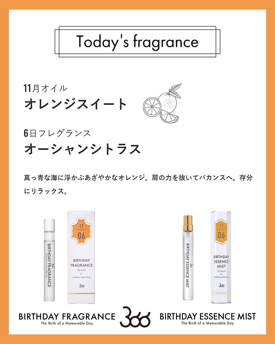 今日11月6日の香りは… 月のオイル: #オレンジスイート 日の香り:#オーシャンシトラス 真っ青な海に浮かぶあざやかなオレンジ。肩の力を抜いてバカンスへ。存分にリラックス。 #バースデーフレグランス #11月生まれ #誕生日香水 🎁SHOP🎁 f-room.shop/pages/366 pic.x.com/h4dZB2BAeE