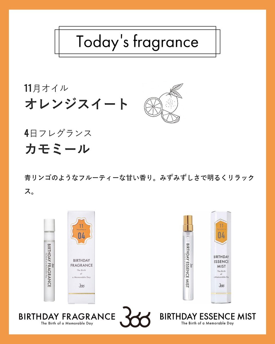 今日11月4日の香りは… 月のオイル: #オレンジスイート 日の香り:#カモミール 青リンゴのようなフルーティーな甘い香り。みずみずしさで明るくリラックス。 #バースデーフレグランス #11月生まれ #誕生日香水 🎁SHOP🎁 f-room.shop/pages/366 pic.x.com/0gRPmoikXu