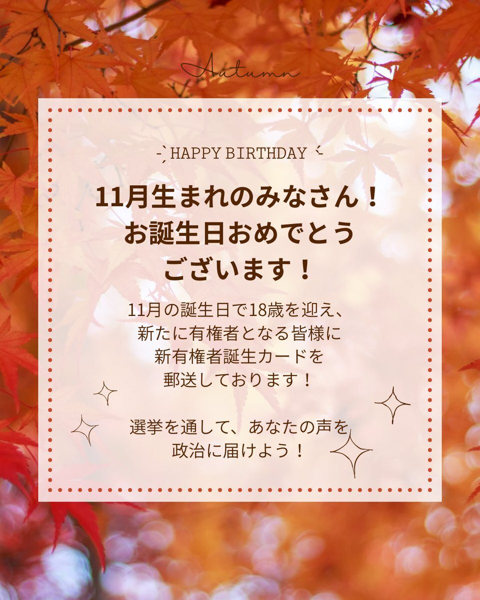 11月に誕生日を迎える皆さん🙋‍♀️🙋🙋‍♂️ お誕生日おめでとうございます🎉 新たに有権者となった皆さんが、選挙を通して積極的に政治に参加してくれることを願っています😌 選挙が近づくと『投票所入場券』をお届けしますので、忘れずに投票してくださいね👍👍👍 #誕生日 #11月生まれ #宇都宮市 pic.x.com/e9ick2WTor