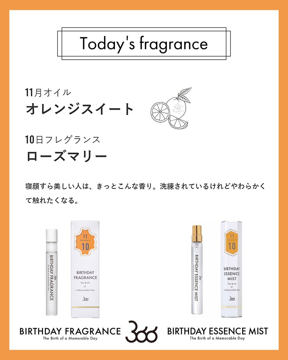 今日11月10日の香りは… 月のオイル: #オレンジスイート 日の香り:#ローズマリー 寝顔すら美しい人は、きっとこんな香り。洗練されているけれどやわらかくて触れたくなる。 #バースデーフレグランス #11月生まれ #誕生日香水 🎁SHOP🎁 f-room.shop/pages/366 pic.x.com/ryziKX6pLW