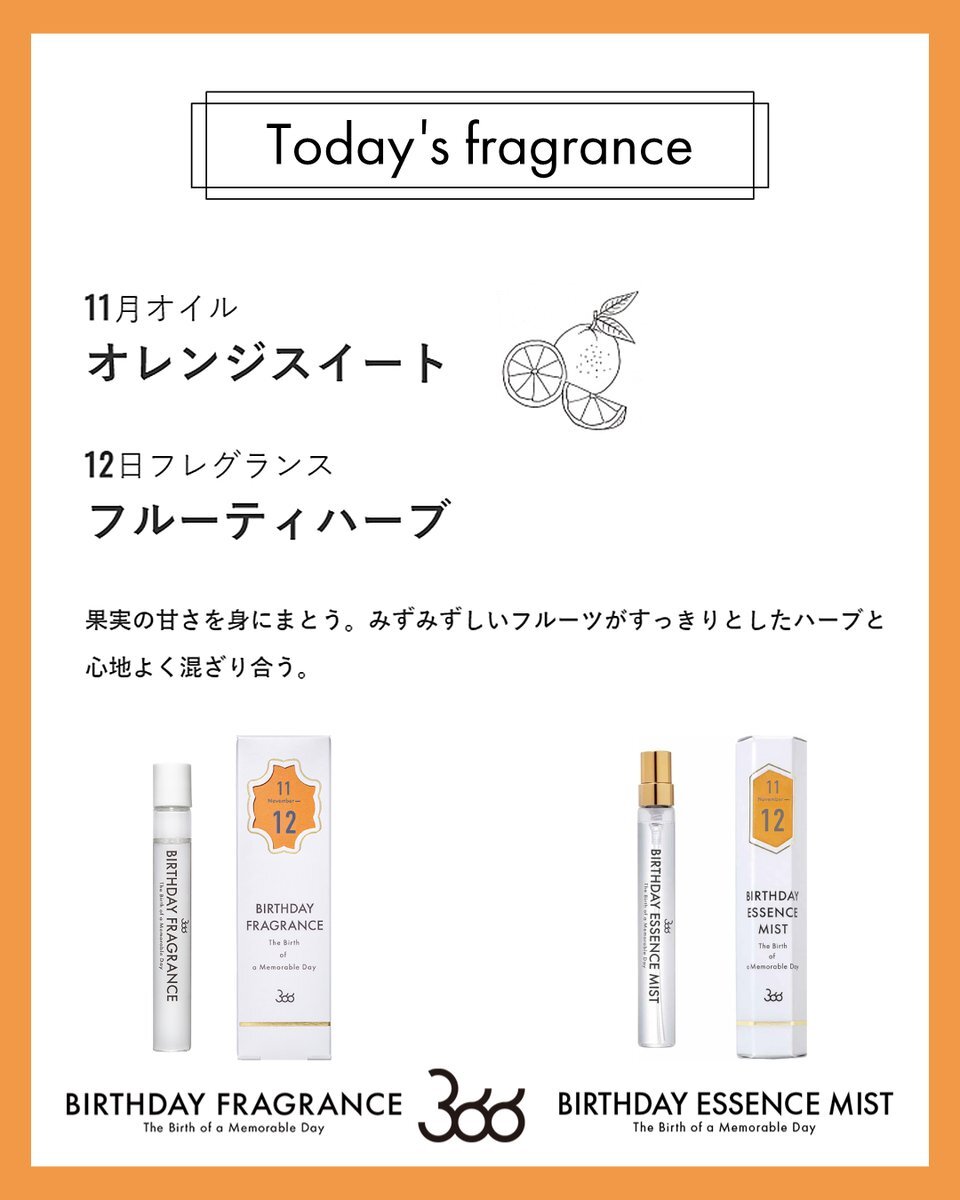 今日11月12日の香りは… 月のオイル: #オレンジスイート 日の香り:#フルーティハーブ 果実の甘さを身にまとう。みずみずしいフルーツがすっきりとしたハーブと心地よく混ざり合う。 #バースデーフレグランス #11月生まれ #誕生日香水 🎁SHOP🎁 f-room.shop/pages/366 pic.x.com/3m4A3Adj5F