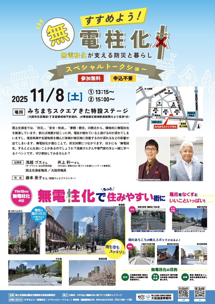 📢すすめよう!無電柱化 ! 11/8(土)、みちまちスクエアきた特設ステ(曽根崎地下歩道)にてスペシャルトークショーを開催します #浅越ゴエ さんや専門家の方と一緒に「#無電柱化」について学べるイベントです 是非ご参加ください!! 詳細はこちら🔎 kkr.mlit.go.jp/osaka/press/20… #11月10日は無電柱化の日 pic.x.com/lvygGVRJXz