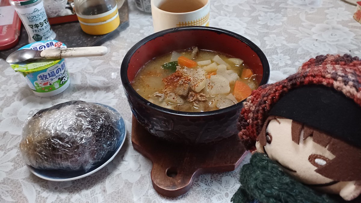 #11月14日はいい石切丸の日 おめでとうございます石切丸様 我が家ではわんぱくじゃないがせがれ(わんぱく)のために奮発してせがれの大好物を作って一緒にお祝いだ!! 焼海苔2枚重ねのおむすび(わんぱくの大好きな明太子入り)、とんがらしモリモリ豚汁 激辛大好きわんぱく pic.x.com/CQ9CvWYmmz