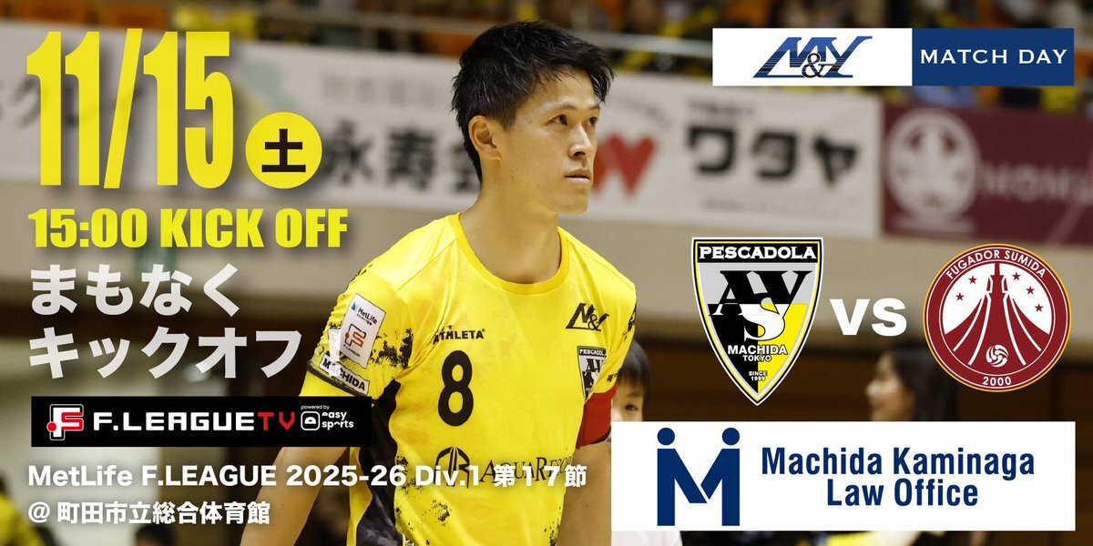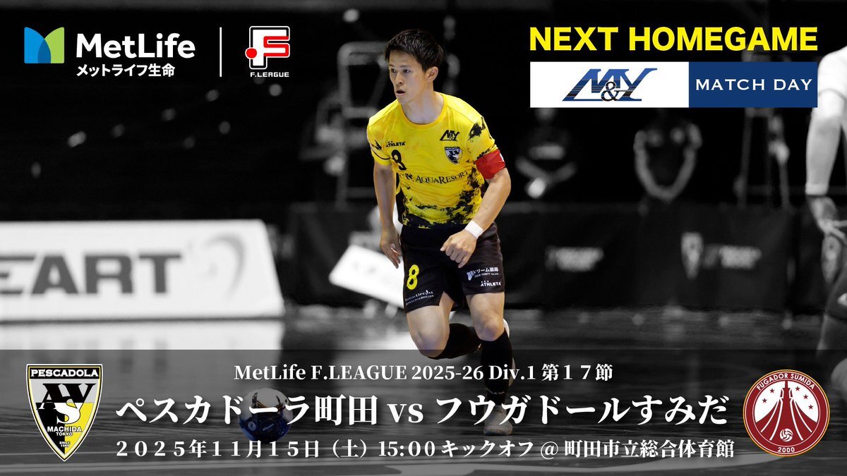 🟡#1115町田vsすみだ ⚫️ ▶︎Metlife F.LEAGUE 2025-26 📅11/15(土) 🕝15:00kickoff 🆚フウガドールすみだ 🏟️町田市立総合体育館 📺 fleague.stores.play.jp/lives/23106bd8… キックオフ‼️ #メットライフ生命Fリーグ #ペスカドーラ町田 pic.x.com/G1Zp0ERFRd