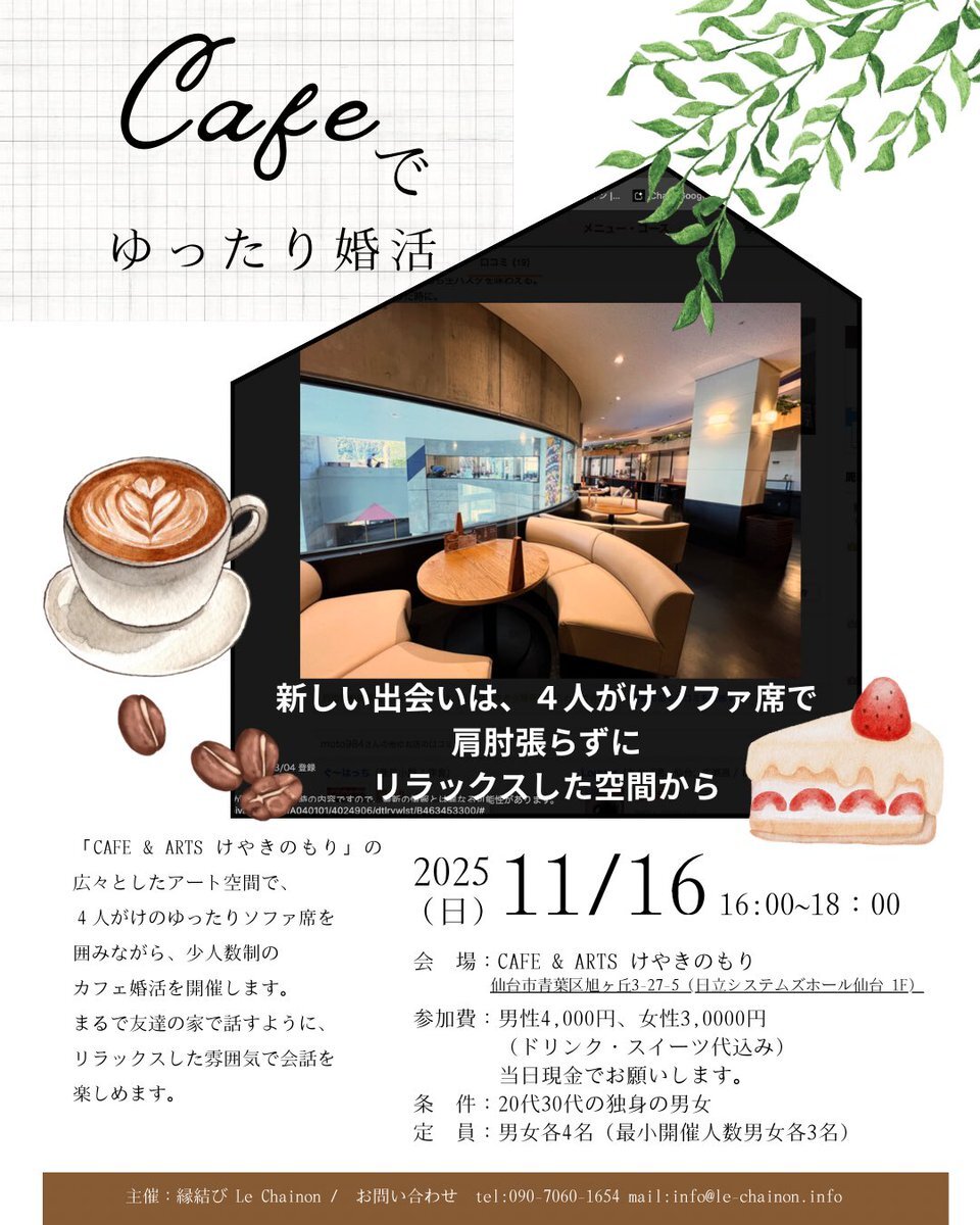 ☕️11/16(日) 16時〜【20・30代限定】仙台カフェ婚活 旭ヶ丘 けやきのもり のゆったりソファ席で少人数交流✨ 全員とじっくり話せる8名限定です。 💰参加費(セット代込):男性¥4,000 / 女性¥3,000 応募はDMへ! #仙台婚活 #20代30代 #カフェ pic.x.com/vkFgvPxwng