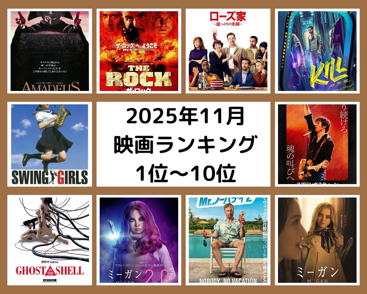 #2025年11月映画ランキング 27本中BEST20 ①アマデウス ②ザ・ロック ③ローズ家~崖っぷちの夫婦~ ④KILL 超覚醒 ⑤スウィングガールズ ⑥スプリングスティーン 孤独のハイウェイ ⑦GHOST IN THE SHELL/攻殻機動隊 ⑧M3GAN ミーガン 2.0 ⑨Mr.ノーバディ2 ⑩M3GAN ミーガン #けんいち映画 pic.x.com/pcsY2hTzZr