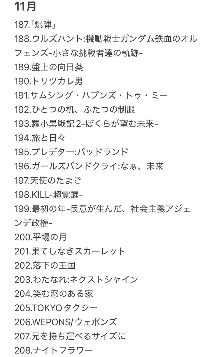 #2025年11月映画ランキング 1. 爆弾 2. 旅と日々 3. 平場の月 4. TOKYOタクシー 5. 港のひかり 6. プレデターバッドランド 7. 盤上の向日葵 8. ガールズ&パンツァー4DX 9. ブラックフォン2 10. ナイトフラワー pic.x.com/cBuo0vxBwD