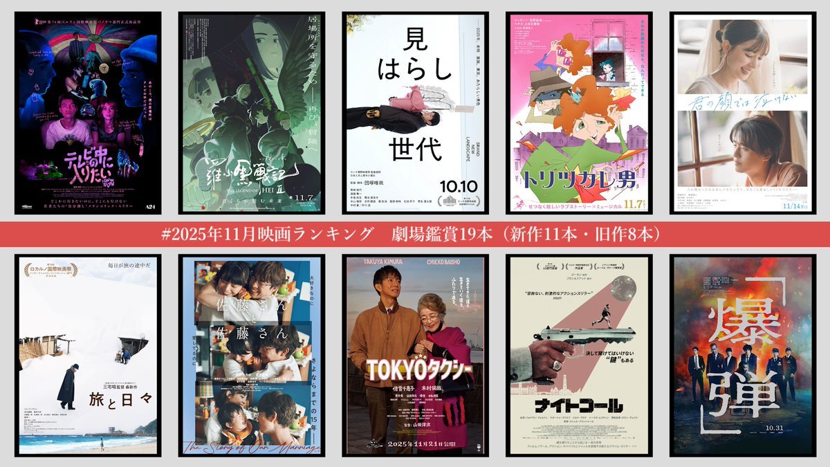 #2025年11月映画ランキング 🥇テレビの中に入りたい(2回目) 🥈羅小黒戦記2 ぼくらが望む未来 🥉見はらし世代 ④トリツカレ男 ⑤君の顔では泣けない ⑥旅と日々 ⑦佐藤さんと佐藤さん ⑧TOKYOタクシー ⑨ナイトコール ⑩爆弾 劇場鑑賞19本。『旅と日々』は来月再鑑賞したい。 pic.x.com/lp8JlROxe5 x.com/anonymous_1_8_…