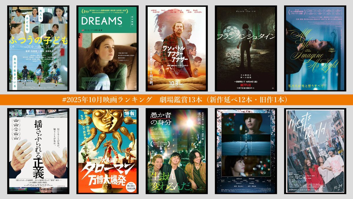 #2025年10月映画ランキング 🥇ふつうの子ども(2回目) 🥈DREAMS 🥉ワン・バトル・アフター・アナザー ④フランケンシュタイン ⑤私たちが光と想うすべて(3回目) ⑥揺さぶられる正義 ⑦大長編タローマン(2回目) ⑧愚か者の身分 ⑨秒速5センチメートル ⑩ミーツ・ザ・ワールド 劇場鑑賞13本。 x.com/anonymous_1_8_…