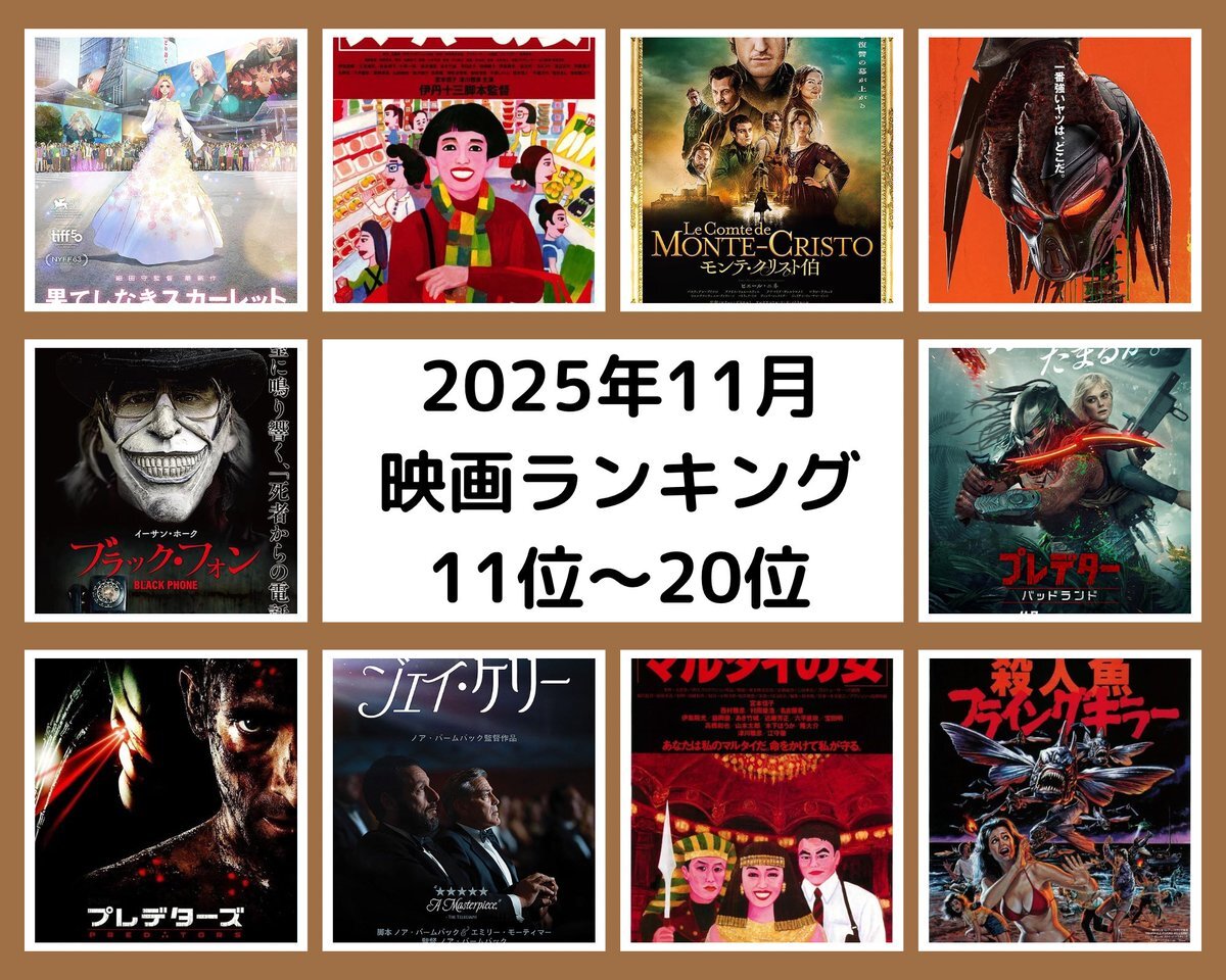 11.果てしなきスカーレット 12.スーパーの女 13.モンテ・クリスト伯 14.ザ・プレデター 15.ブラック・フォン 16.プレデター バッドランド 17.プレデターズ 18.ジェイ・ケリー 19.マルタイの女 20.殺人魚フライングキラー #2025年11月映画ランキング #けんいち映画 pic.x.com/dKYrxOCWPE